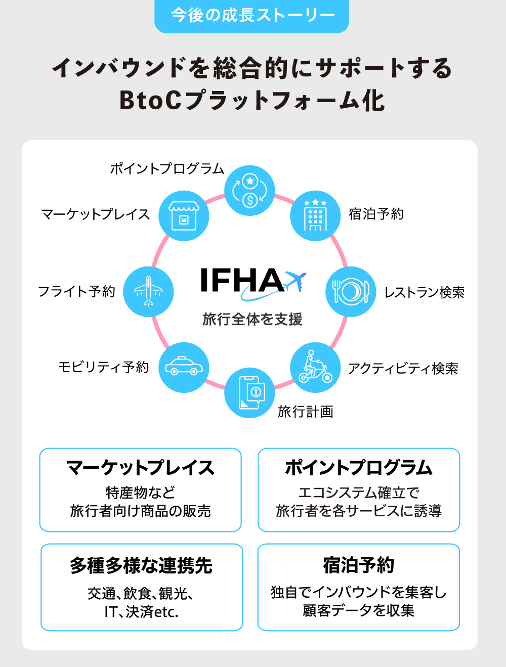 このような展開を通じて、世界各国のインバウンド需要に応えるプラットフォームを構築し、膨大な旅行客のビッグデータを活用したビジネス展開も目指します。