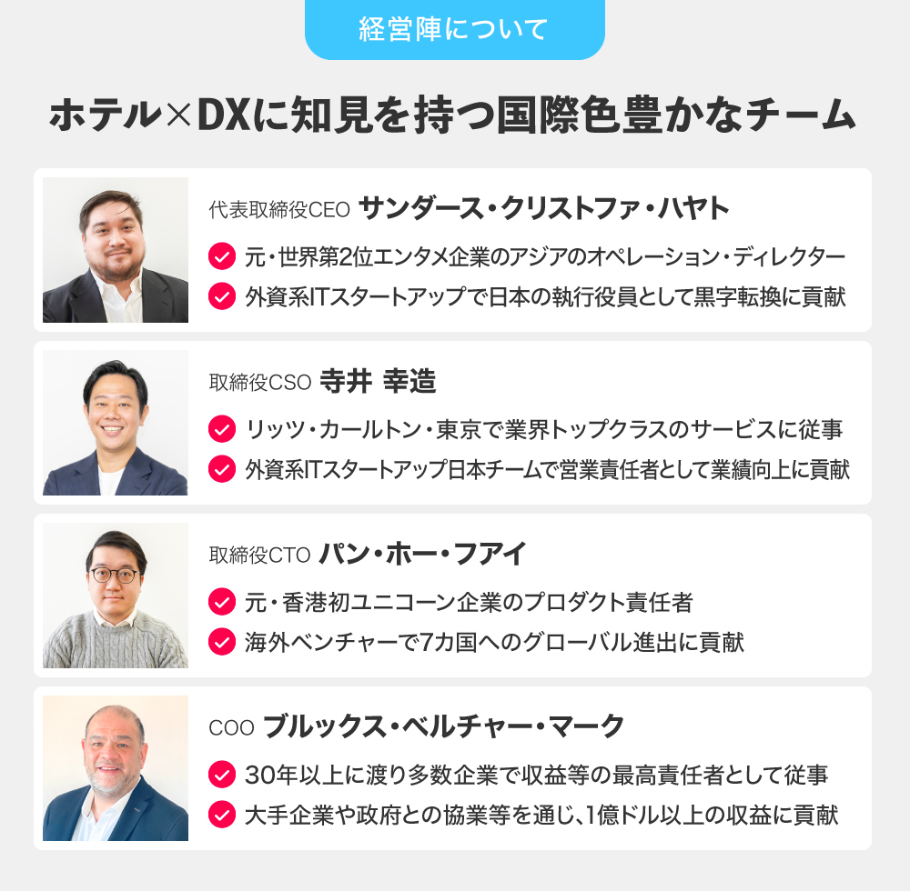 また、Tabilife代表のクリストファーサンダース氏を始とするメンバーの多くが宿泊施設向けサービスやホテルで以前活躍されており、宿泊施設のニーズを熟知されており、必ずや大きな結果を出していくと信じております。