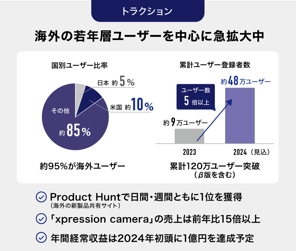 「xpression」シリーズは現在、世界200以上の国・地域でシリーズ累計120万以上のユーザーがいます(過去にリリースしたβ版のDL数も含む)。その約95%が海外ユーザーであり、「Product Hunt」※では、日間・週間ともに1位を獲得するなど、若年層を中心に受け入れられています。