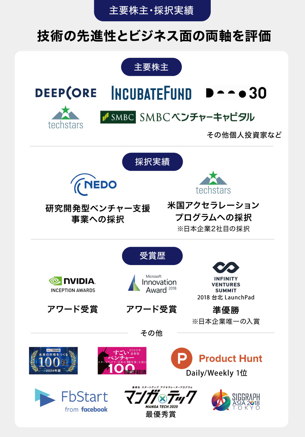 そうした技術面やビジネスモデルが評価され、「NVIDIA Inception Awards」を受賞したり、「Microsoft Innovation Award」を受賞するといった実績があります。