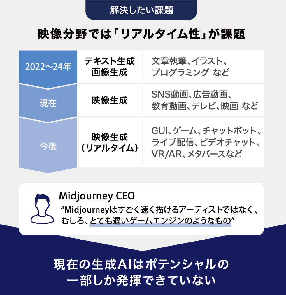 一方で、現在の生成AI市場の数歩先にある“リアルタイムでの映像生成AI”においては、グローバルで十分な勝機があると考えています。