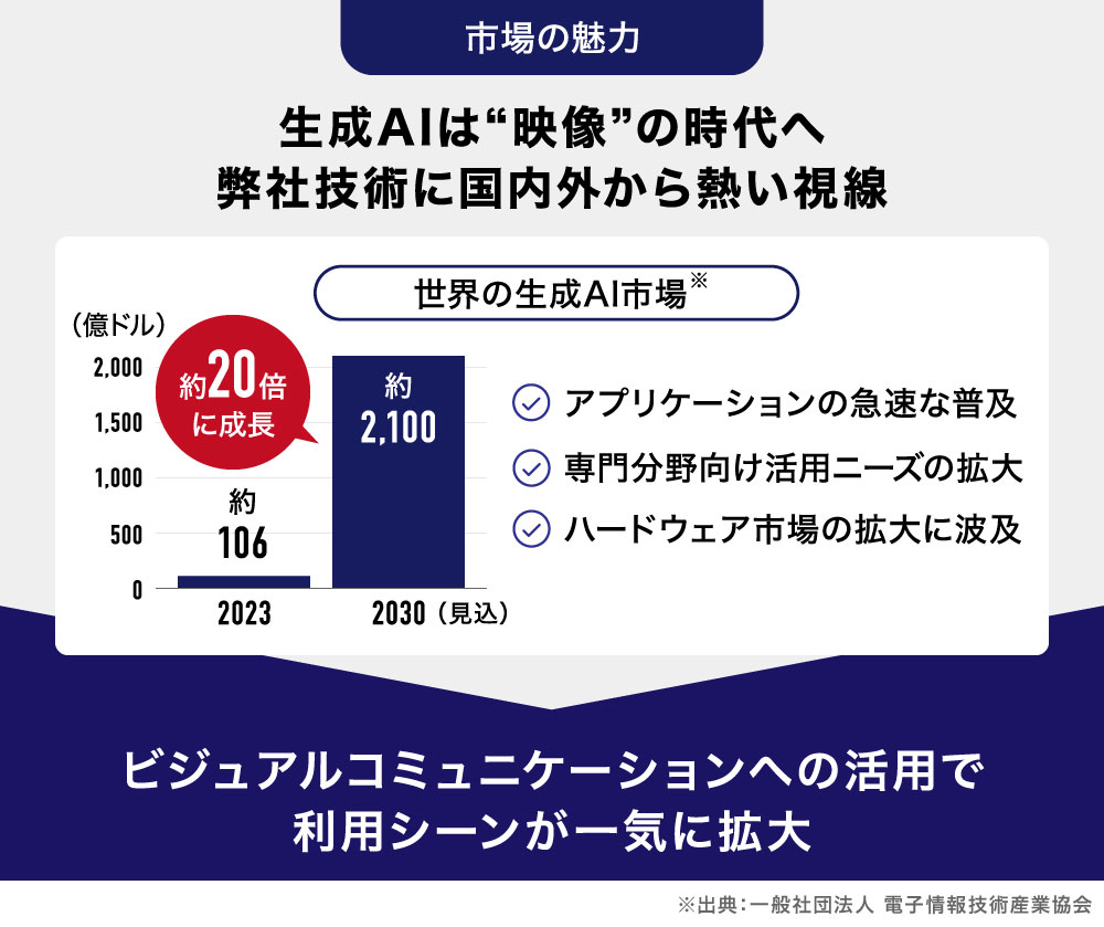 2023年の世界の生成AI市場は約106億ドルですが、2030年には約20倍の約2,100億ドル以上に成長すると予測されています※。