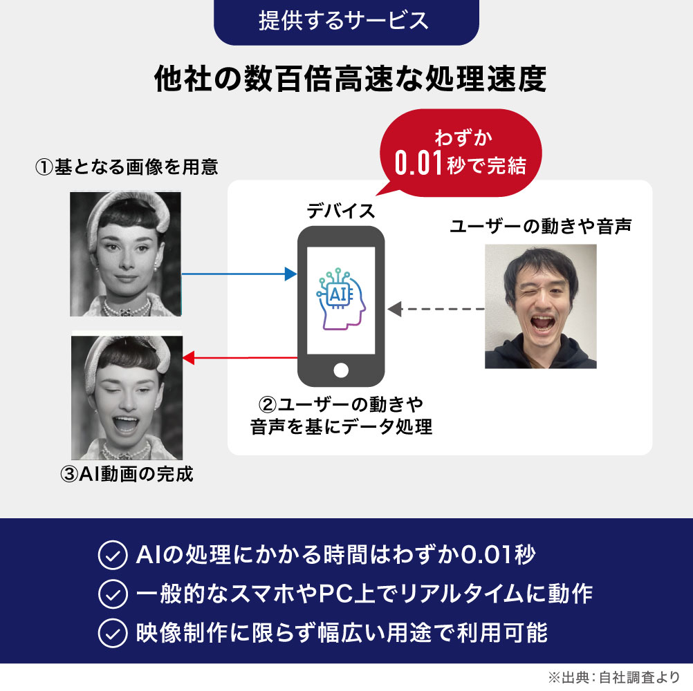 弊社のAI映像生成技術は、世界でトップレベルの処理速度を誇る競合企業より50倍以上、一般的な競合企業より数百倍以上高速で、一般的なスマホやPCなどのデバイス上でリアルタイムで動作するのは弊社技術のみであると考えています(自社調査より)。