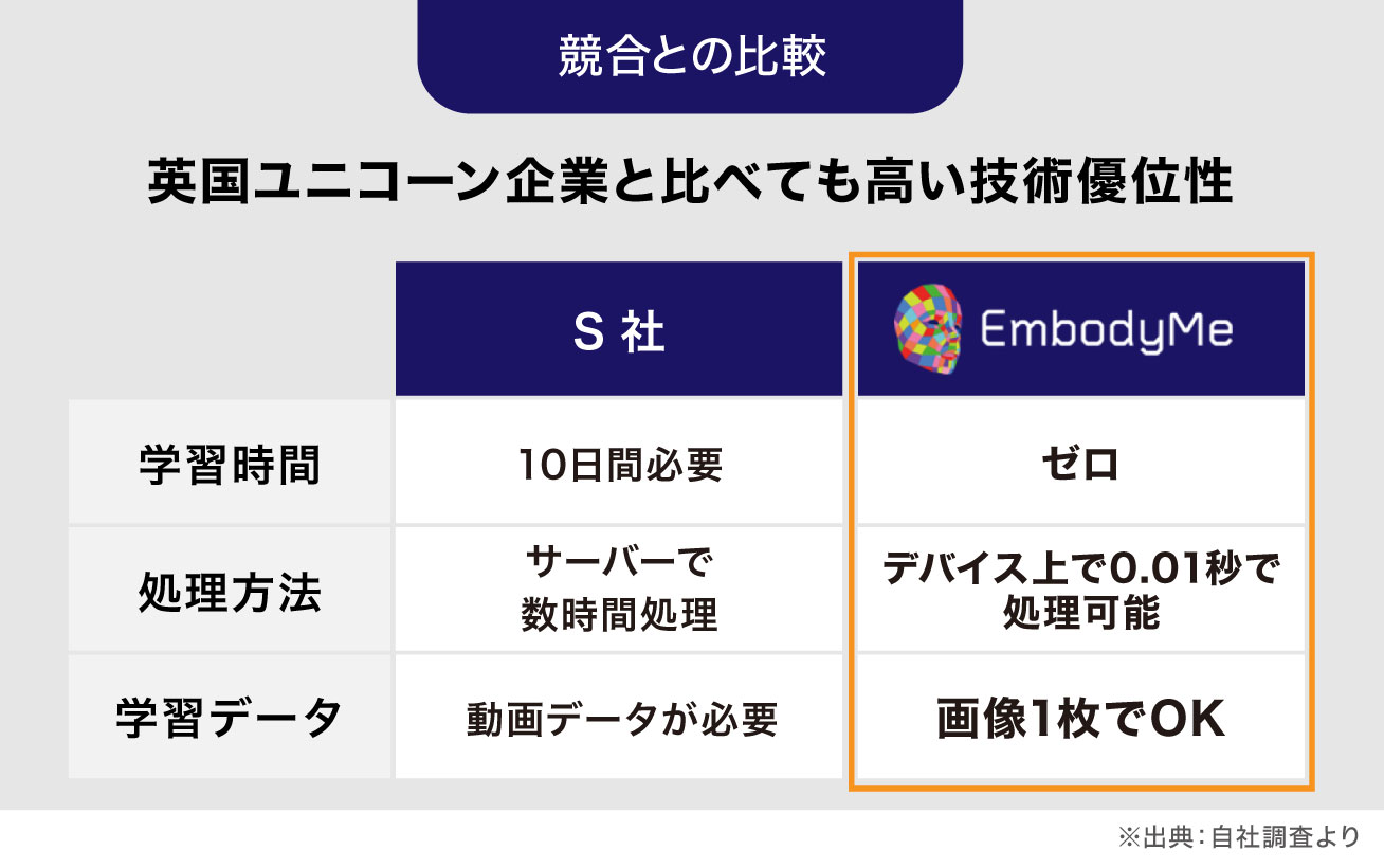 この分野をリードする時価総額約10億ドルの英国の企業S社は、これまでに累計約1.5億ドルを調達して話題となっていますが、弊社のコア技術は、S社よりも処理時間、学習時間、利用シーンの多様さ、利便性の面で優位性があると自負しています。