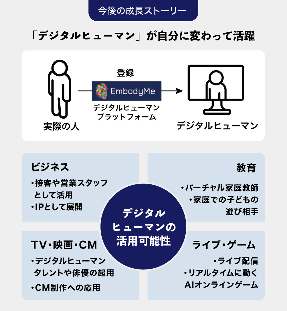 弊社は、こうした「デジタルヒューマン」の時代におけるプラットフォーム企業になることを目指しています。人間の能力の限界を越え、生と死のような人間の在り方を超えて、新しい人間の未来を創造する企業になりたいと考えています。