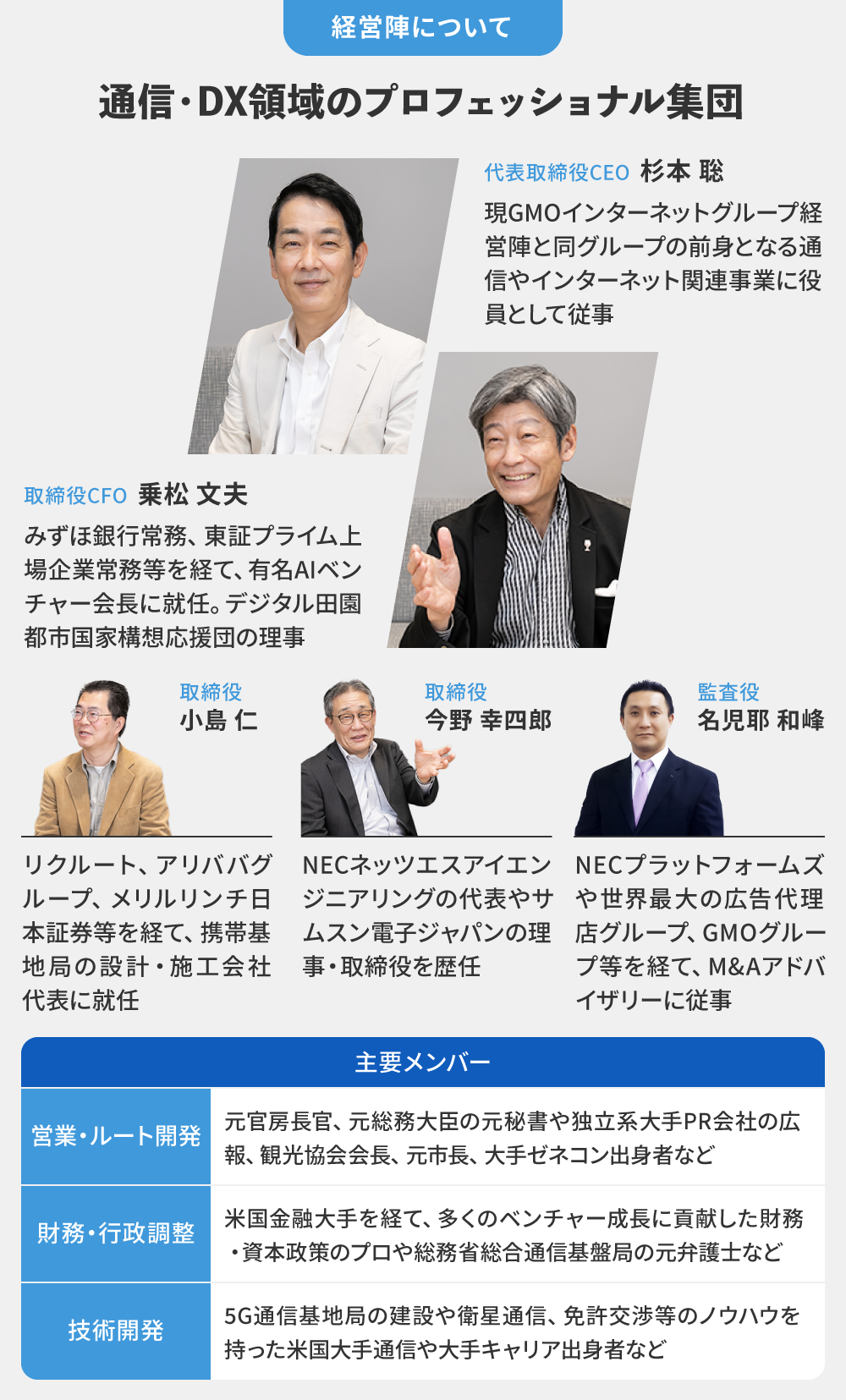 弊社経営陣は、設立間もないベンチャーには珍しく、多方面のプロフェッショナルで構成されています。また、元政府の要職や大手企業での実績豊富なメンバーも集結し、営業、財務、技術開発それぞれの専門家が集う強固なチームを形成しています。
