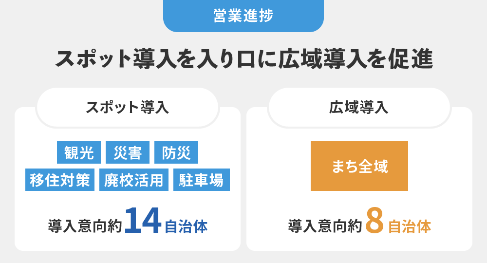 直近は導入実績を訴求して信頼を獲得し、全国の自治体への展開に注力しています。すでに、まちのWi-Fi整備を掲げる自治体への導入が纏まる見通しです。