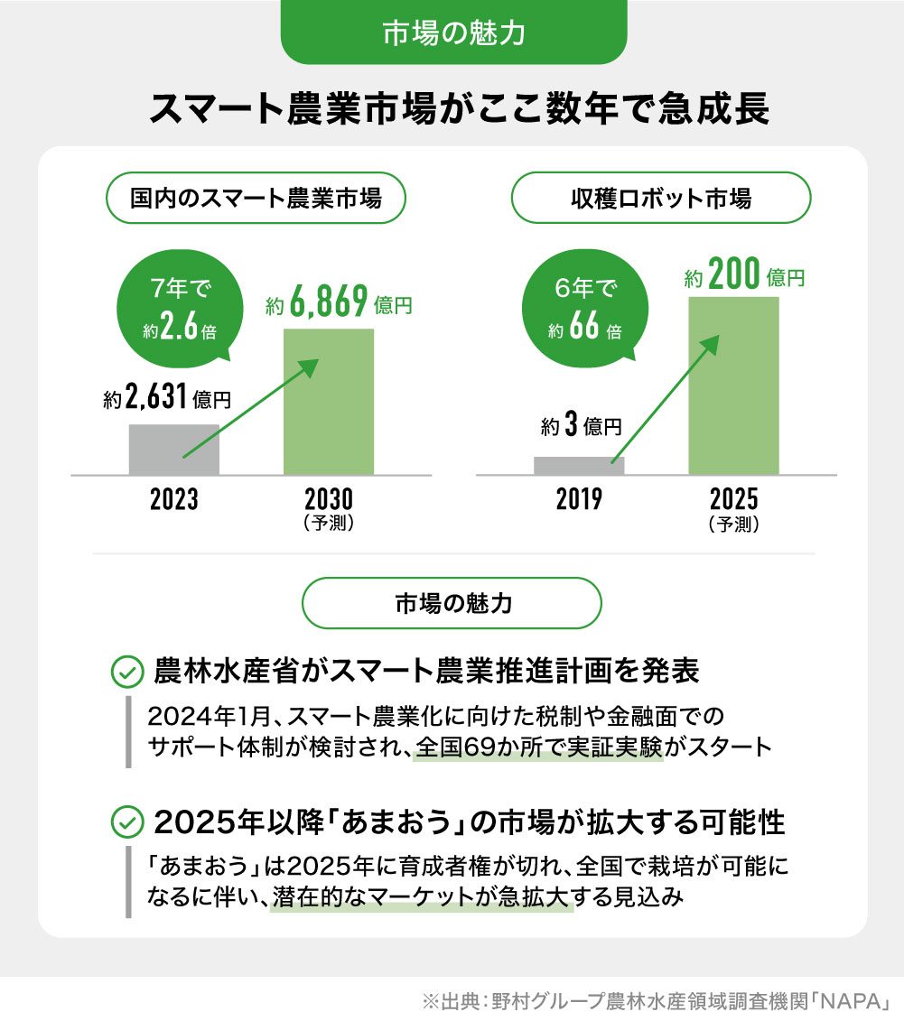 ããã«ãã£ãŠã蟲家ãåç©«ãããããªã©ã®ICTæ©åšãå°å ¥ãããããªãããã蟲äœç©ã®äžã§é«ä»å 䟡å€åãããã¡ãã¯èšåæè³ã®æè³ååããããããããããã«ã¹ããŒã蟲æ¥åãå éãããšèããŠããŸãã