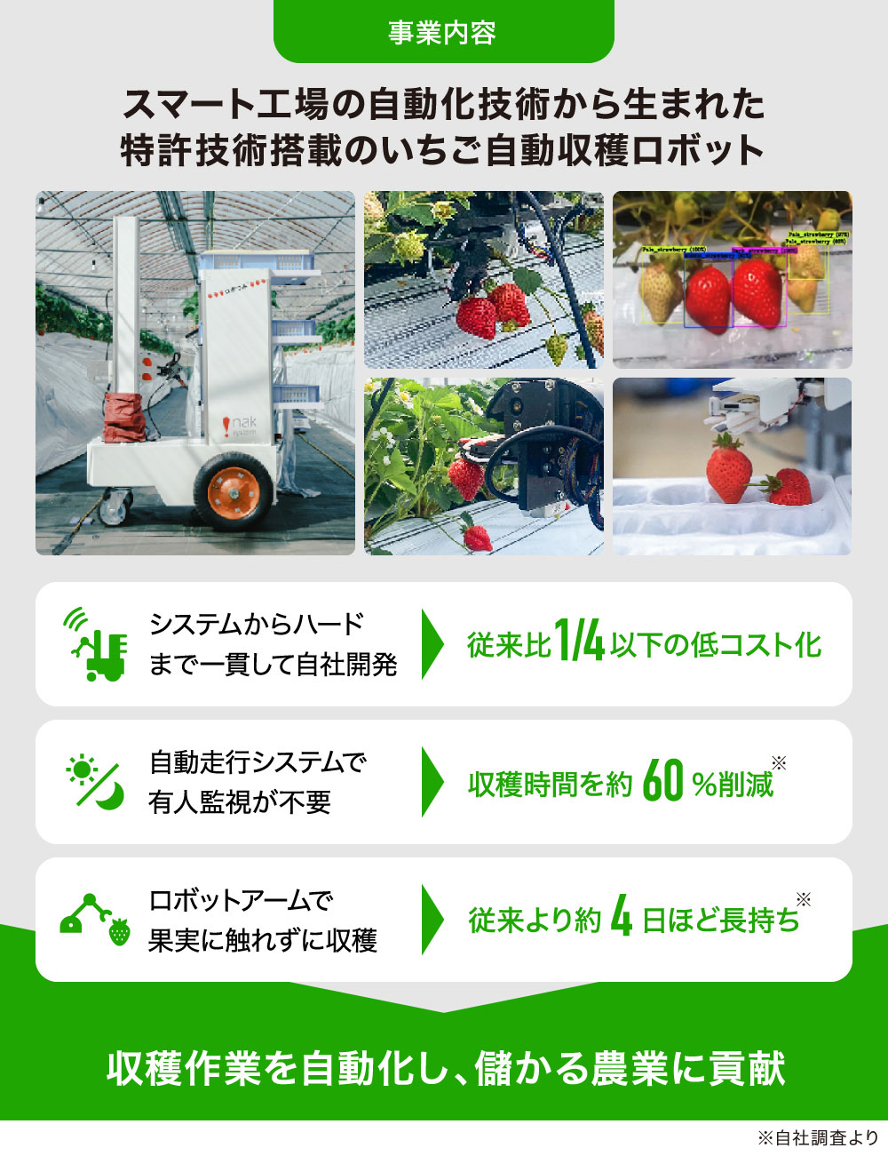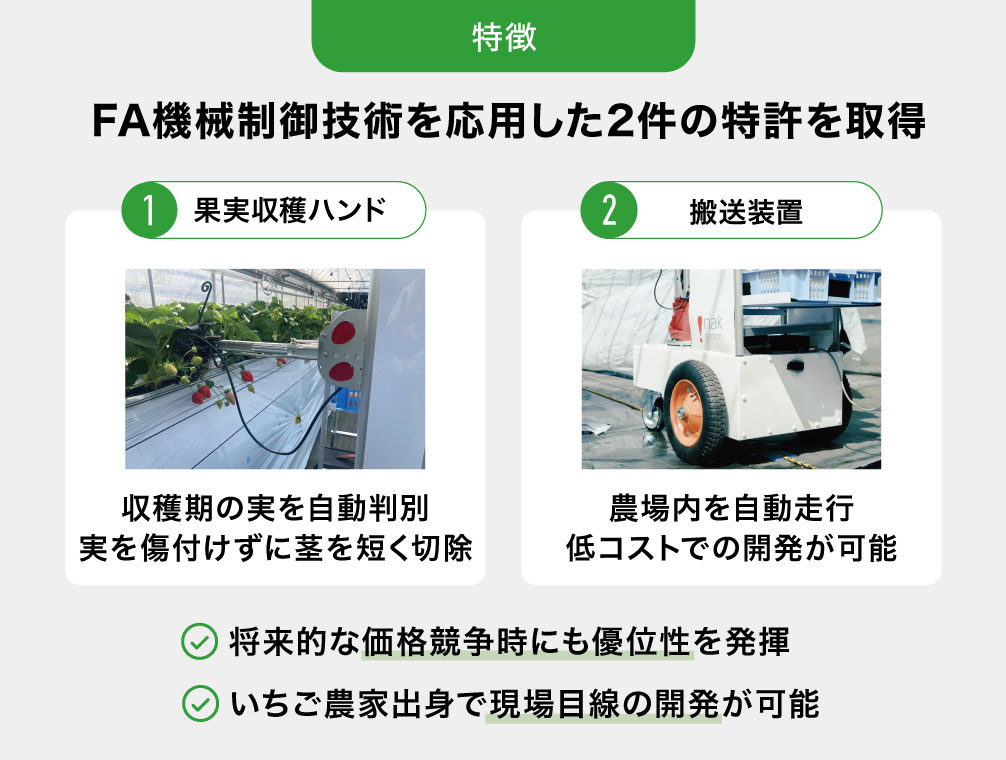 2022幎ã«ã¯ããããã®æè¡ã掻ãããŠããã¡ãèªååç©«ãããããããã€ã¿ããéçºããŸããããããã€ã¿ãã¯2ä»¶ã®æè¡ç¹èš±ãååŸããäœã³ã¹ãåãå®çŸããããšã§å°æ¥çãªäŸ¡æ Œç«¶äºã«ãªã£ãéã«ãåªäœæ§ãä¿ãŠããšèããŠããŸãã