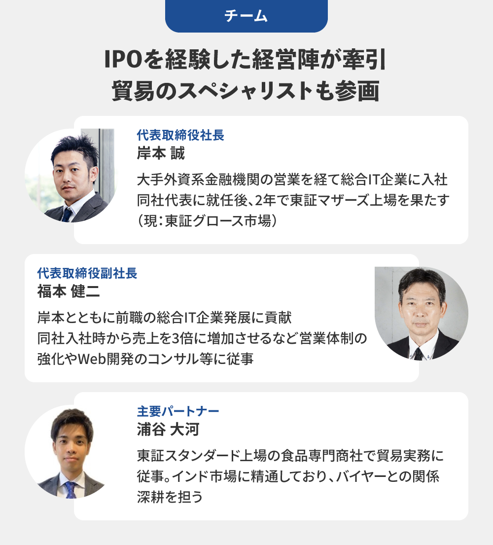 チームメンバーには、岸本とともに前職でIPOを牽引した福本がCOOとして参画。同氏は豊富なコンサル経験やAI、DX分野にも精通しています。また、飲料食品分野の大手専門商社出身の貿易のエキスパートやMBA(経営学修士)取得者などが揃っています。