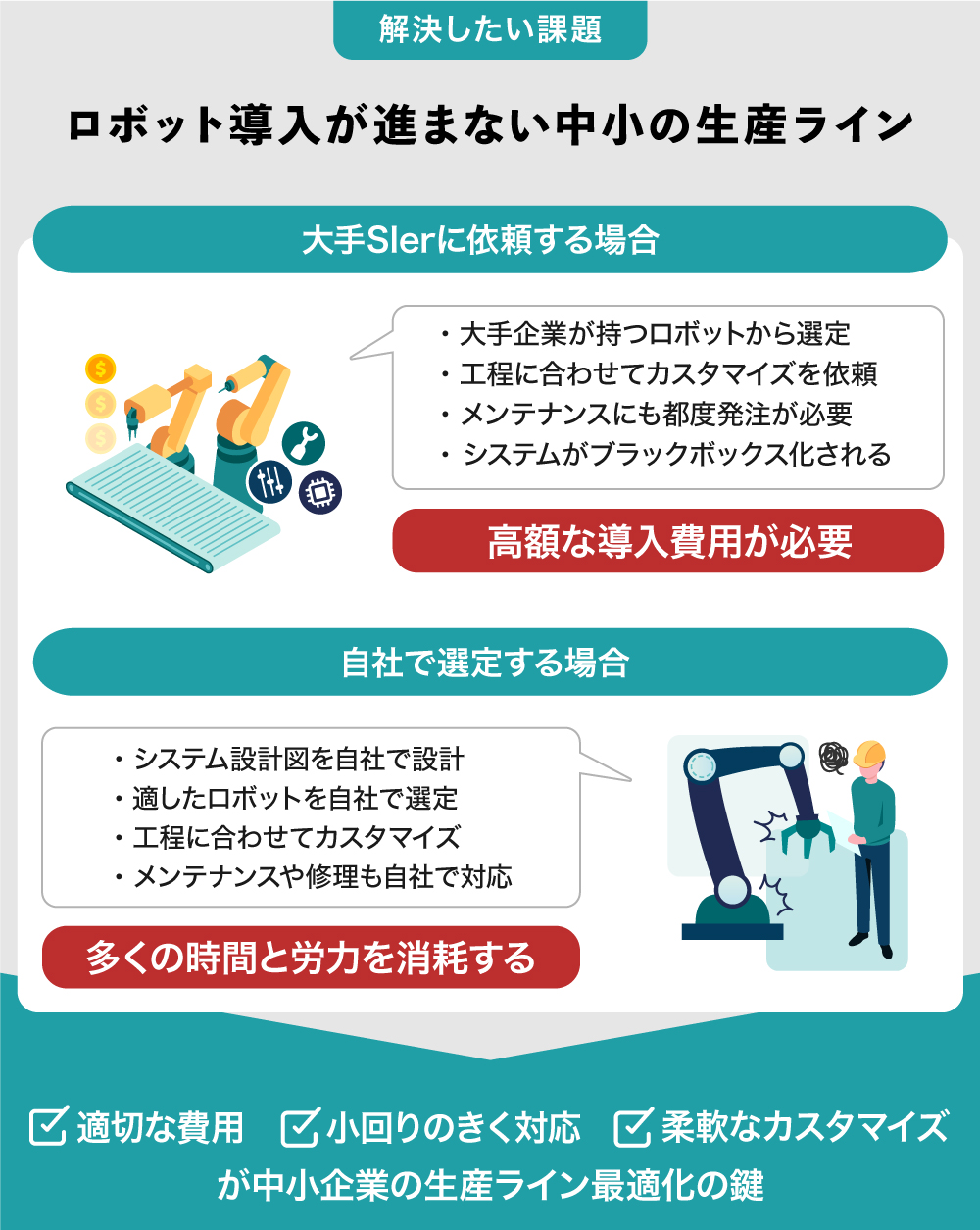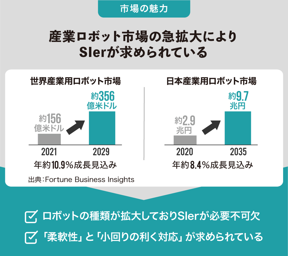 一方で、多くの企業にとって、ロボットの戦略的な導入や生産ライン最適化、アフターメンテナンスにはハードルがあります※2。そこで、弊社のようなロボットSIerへのニーズが非常に高まっており、中でも、弊社が得意とする柔軟性と小回りの利く対応が求められていると考えています。