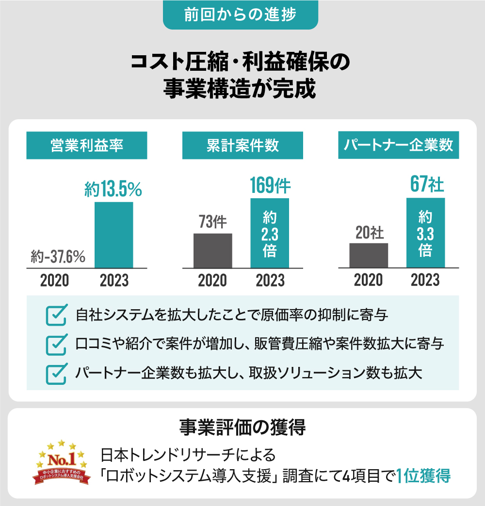 2019年~2023年は医薬業界以外、物流業界/金属加工業界/食品加工業界など様々な業界の自動化装置とロボット治具を累計35パッケージ製作していましたが、ゼロから応用技術の細分化を行ったため、スピード感が出ませんでした。2024年からはスピードアップできるように、内製したシステムを活用する他、大手商社やコンサル会社との提携も実施して案件の進行を加速していく計画です。