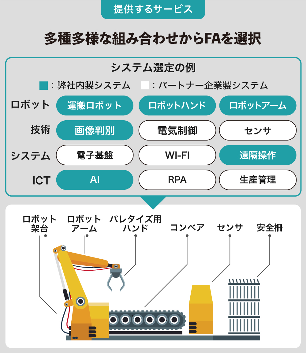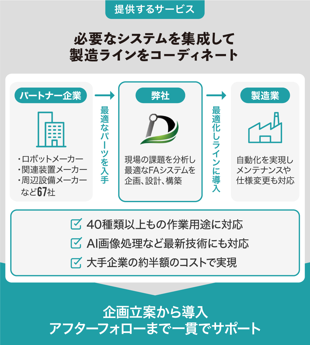 そこに弊社が介入し、製造現場のニーズを的確に把握し、自社システムとパートナー企業の技術を用い、企業ごとに最適なFAシステムをコーディネートしています。