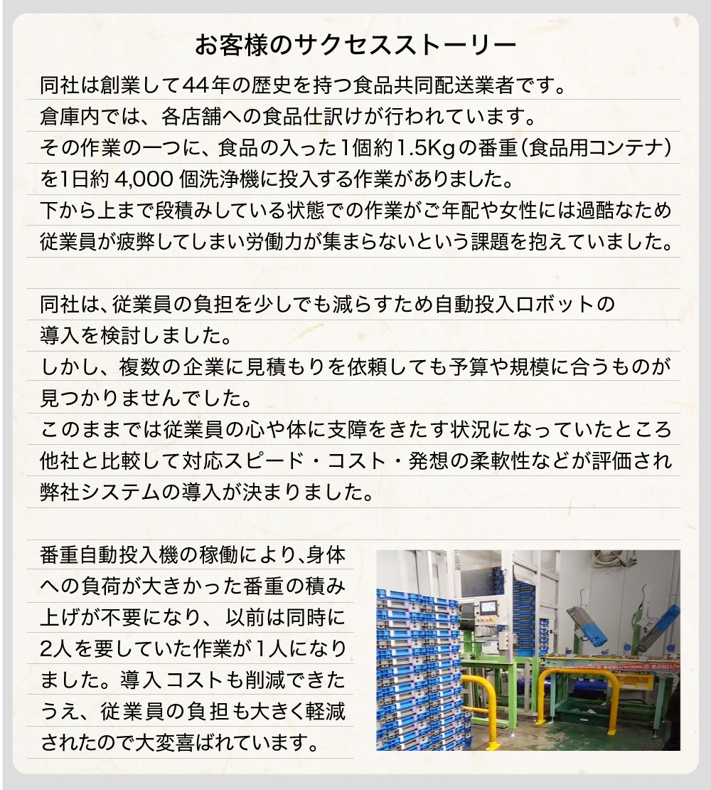 | FA内容 | 食品物流倉庫にて、番重(食品用コンテナ)を洗浄機に投入するロボット |
