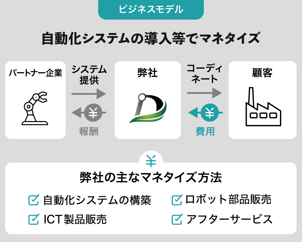 弊社の強みである、多種多様なロボットの技術選定(技術細分化)が進み、弊社独自のソリューションも仕上がりました。そのため、企業へのFAシステムの導入に際して、コストを下げつつも利益を確保する方法も目処がついてきました。
