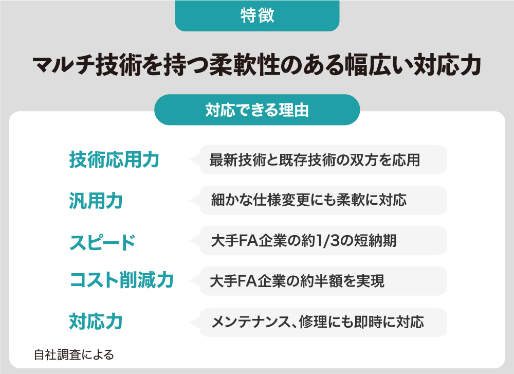 工場の人でも気付かない程の僅かなスペースにFAシステムを導入し作業を効率化するなど、独自の着眼点と機動力で生産現場に寄り添った事業展開を得意としています。