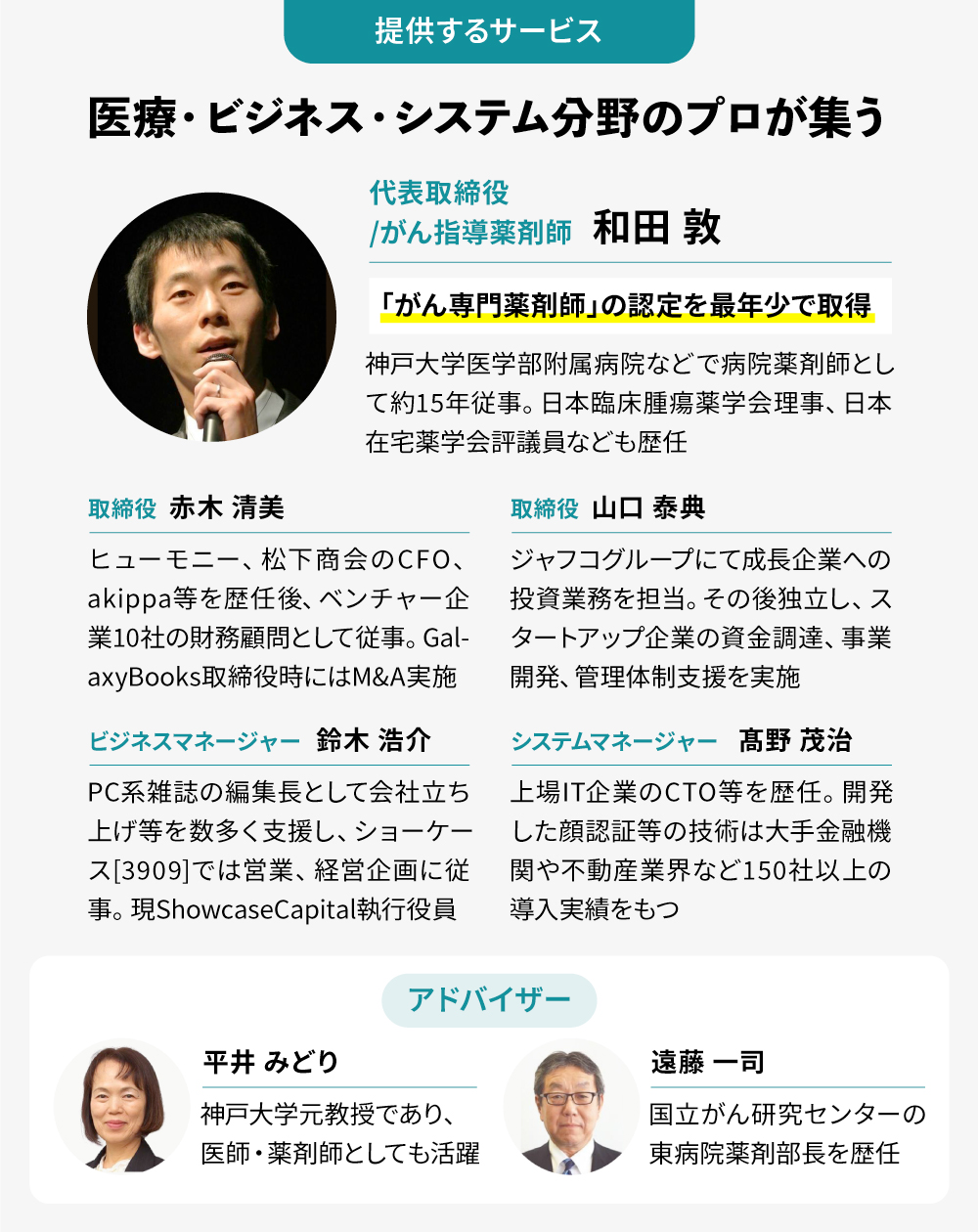 キャリアの中でのご縁から、神戸大学元教授の平井みどり氏や日本臨床腫瘍薬学会元理事長の遠藤一司氏にアドバイザーとして事業に協力をいただき、業界や行政とも太いパイプを築けております。