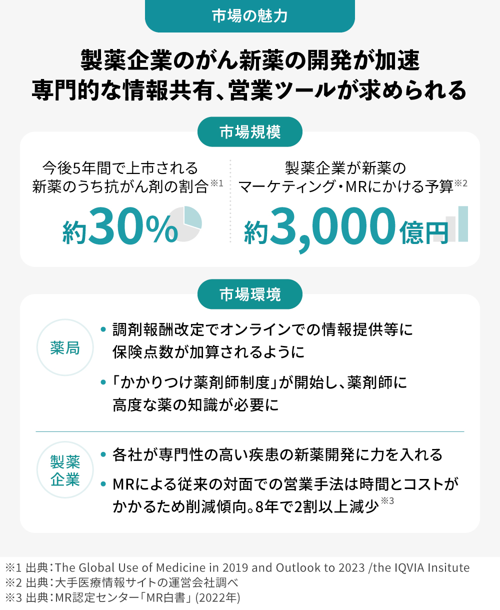 製薬企業が新薬のマーケティング・MR(製薬会社の医療情報担当者)にかける予算は3,000億円程度と推定され※1、これが弊社の狙う市場となります。