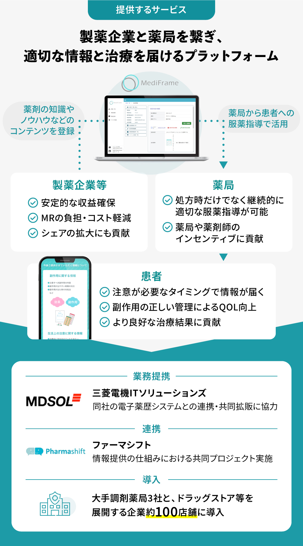 近年、高度な薬物療法を受ける患者さんが増加しておりますが、その中で弊社は、製薬企業や高度医療機関が持つ薬剤に関する知識や、投薬ノウハウを、全国の調剤薬局で広く利用できるプラットフォーム「MediFrame」を提供しています。