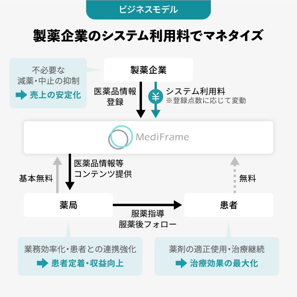 「MediFrame」の導入薬局を大口で確保し、利用者数の拡大を目指します。この実績によって、製薬企業からの受注が確定する見通しです。また、業務提携を締結した大手システム開発企業のほか、他社ベンダー等複数のサービスとのシステム連携に向けた取り組みを進めています。