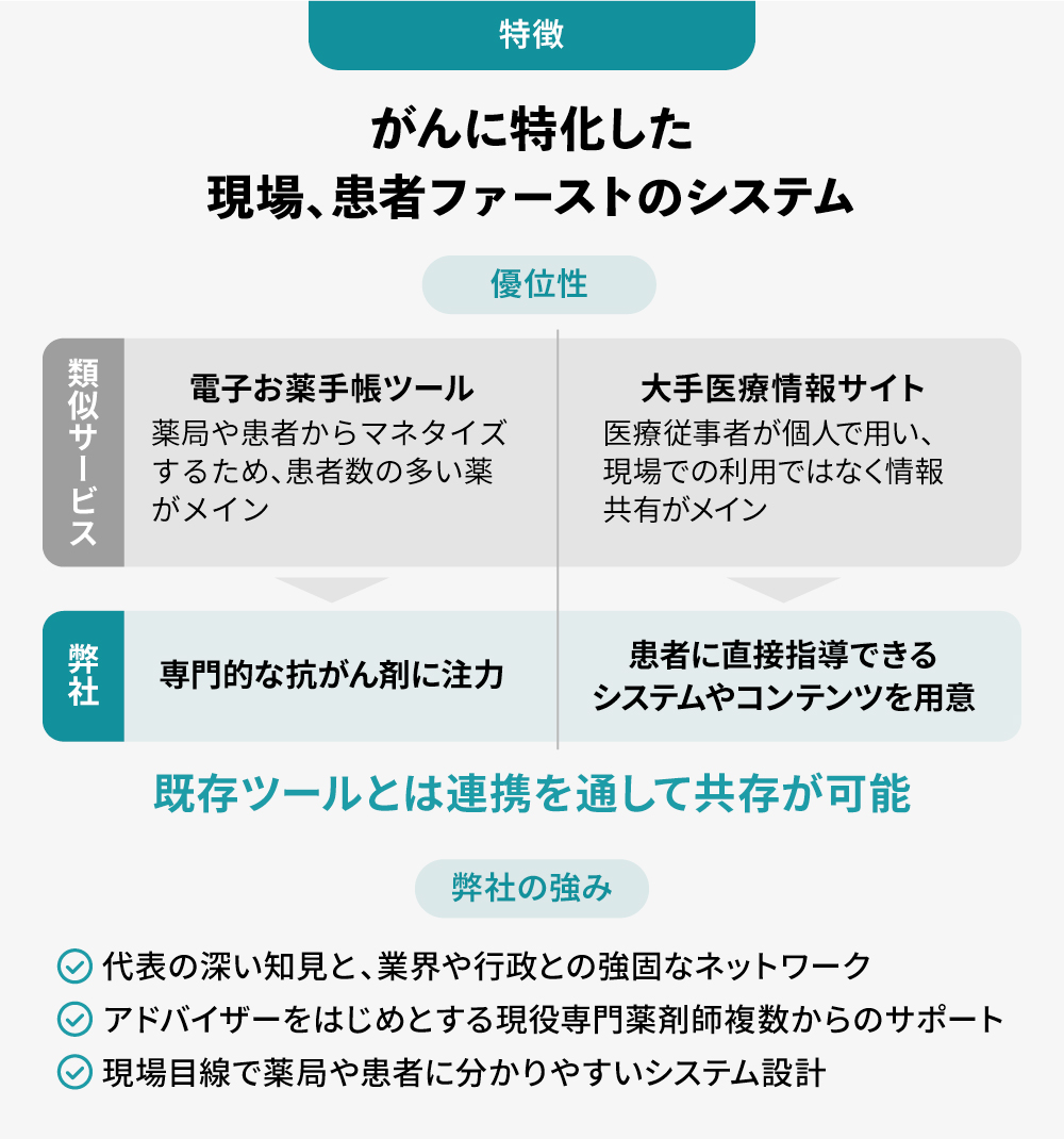 競合関係ではなく、既存ツールのオプションとして弊社の抗がん剤関連コンテンツを提供する等の連携を通して、共存する形でより多くの患者さんに情報を届けられるのではないかと考えています。
