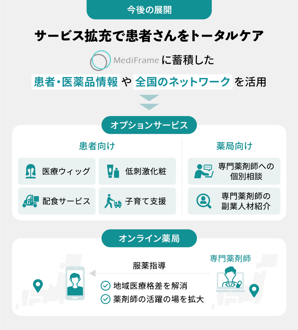 将来的には、オンラインで専門薬剤師が服薬指導を行うオンライン薬局事業の構想もあります。