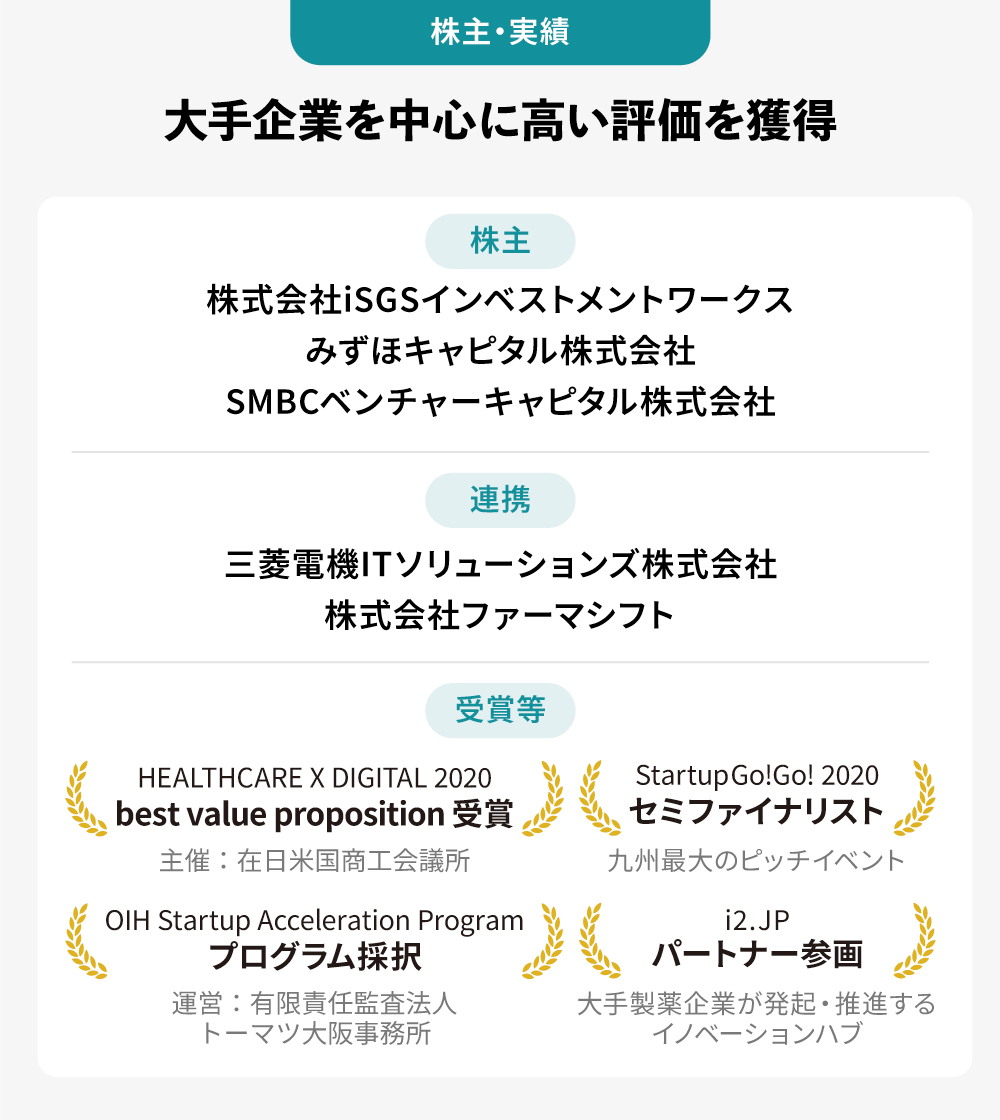 また、デジタル技術を用いた革新的な医療課題の解決策のピッチイベント「HEALTHCARE X DIGITAL 2020」ではBest Value Propositionを受賞するなど、外部からも高い評価を得ています。