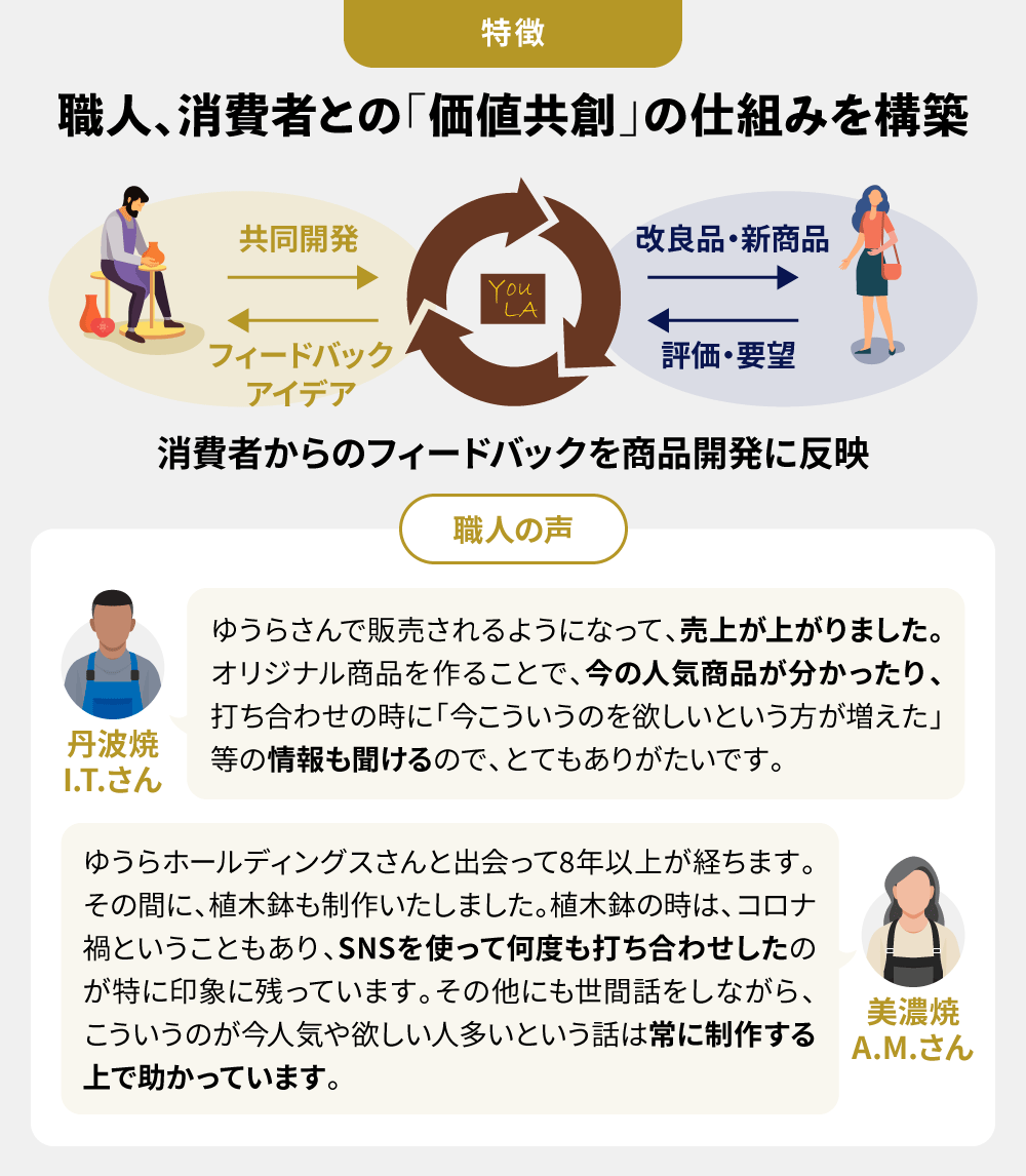 そのような背景のもと、ゆうらホールディングス株式会社は、優れたものづくりの技能をお持ちの職人さんたちの販路確保、拡大をサポートすることで、衰退する伝統工芸技術の継承を守りつつ、優れた伝統工芸品を日常生活で使うことによってお客さまたちのライフスタイルをより豊かにするお手伝いを目指す企業としてスタートしたことは、高い志を持った起業であったと誇りに思います。