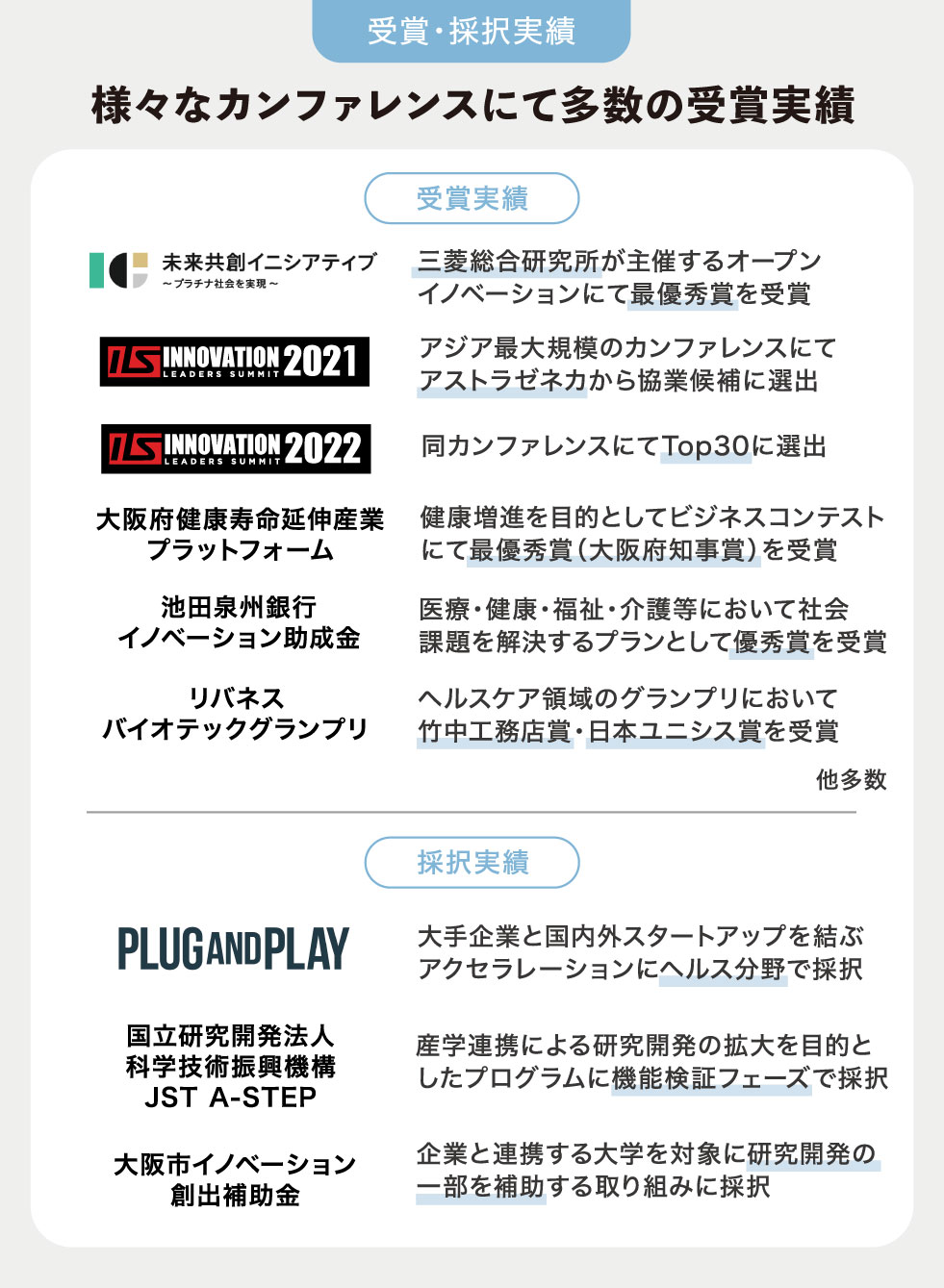 また、株式会社三菱総合研究所(以下、三菱総合研究所)が主催するオープンイノベーション「ICF Business Acceleration Program2023」にて最優秀賞を受賞したり、アジア最大級のカンファレンス「イノベーションリーダーズサミット」にてアストラゼネカ株式会社から協業候補に選出されるなど、様々な形で評価をいただいています。