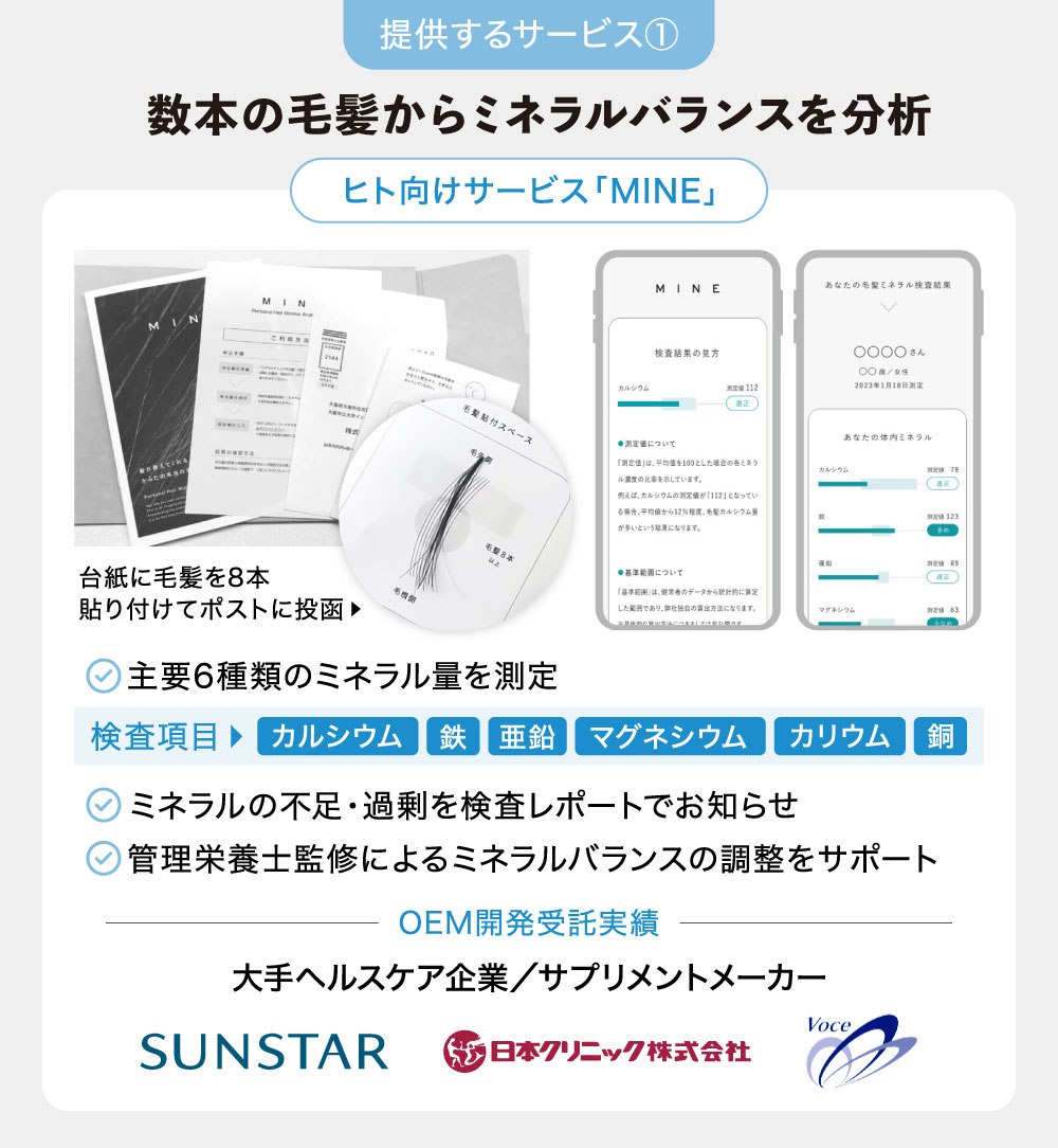 ミネラルの過不足を把握することで、「何をどれだけ摂取すべきか」について手軽に判断できるようになります。また現在は、自社ブランド商品の販売だけでなく、大手ヘルスケア企業やサプリメントメーカーなどから毛髪検査サービスのOEM開発を受託しています。