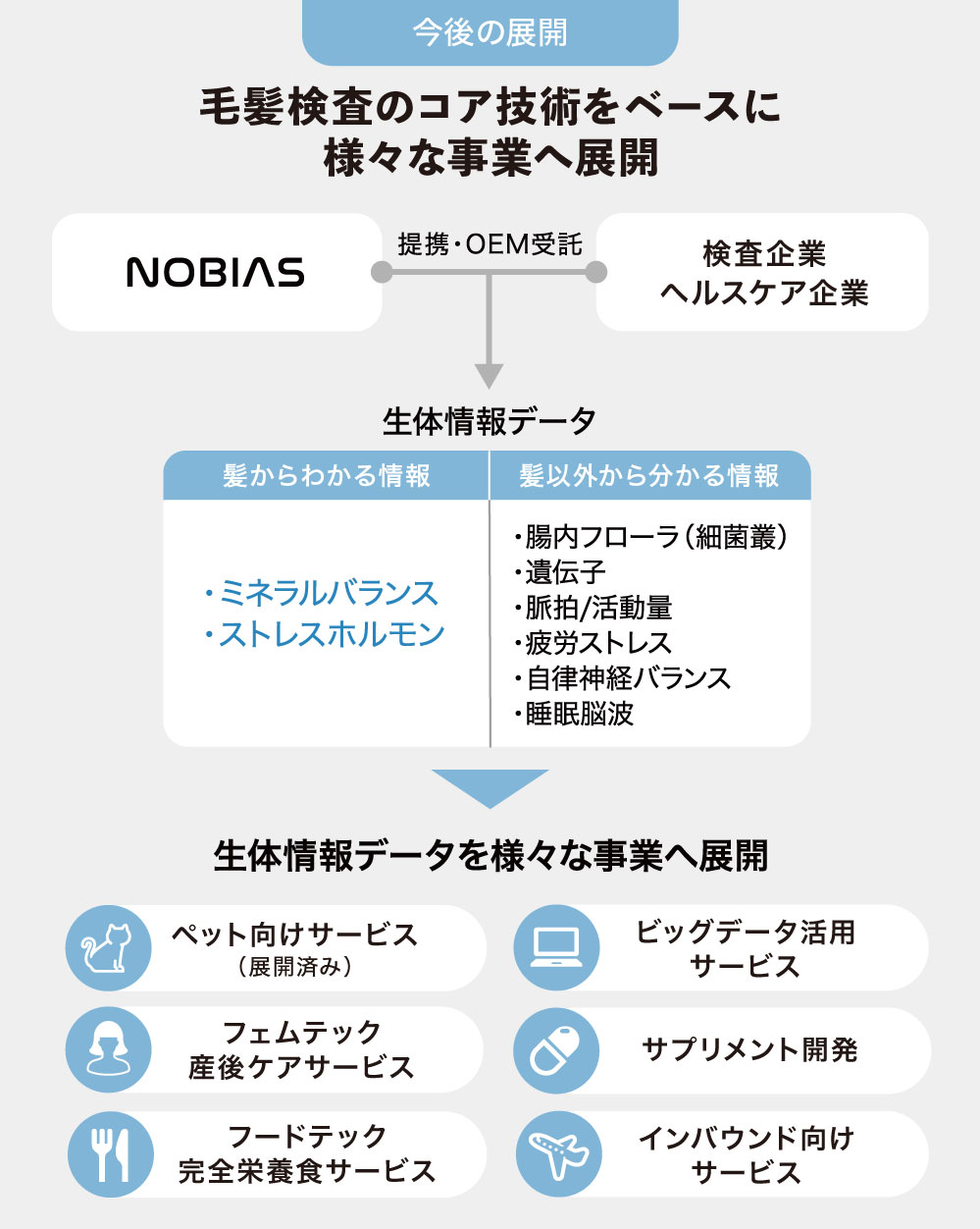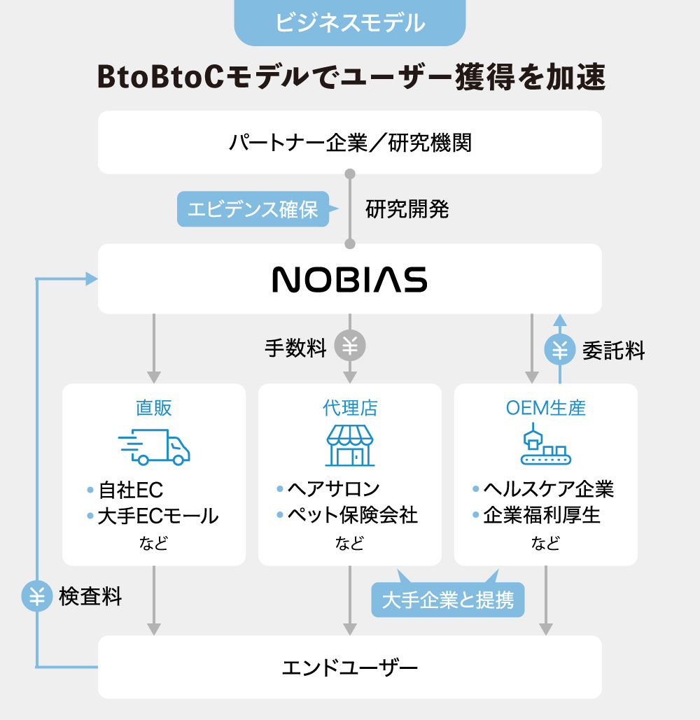 直近は、三菱総合研究所や臨床検査機関などパートナー企業との提携により、BtoBでのニーズが増加しています。現在は、毛髪検査サービスを受託するOEM事業が売上比率として最も大きく成長しており、今後もBtoBtoCで販路を拡大する計画です。
