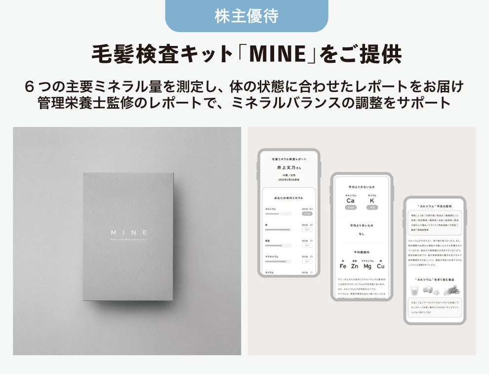 弊社は、大阪公立大学発のヘルスケアベンチャーとして、数本の毛髪から体内の必須ミネラル量を計測し、健康管理をサポートする「MINE(マイン)」を提供しています。