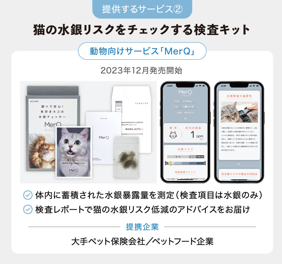 このような実績を背景に、2023年12月からは大手ペット保険会社と提携し、ペット向けの水銀検査キット「MerQ(メルキュー)」の提供も開始しました。