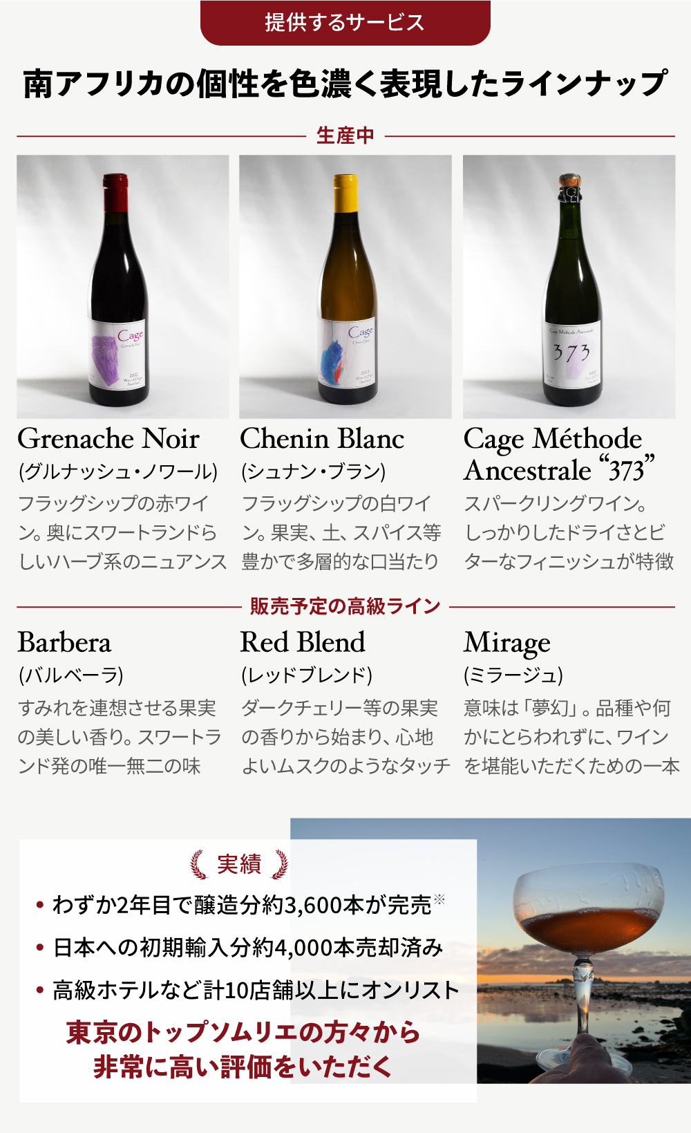 弊社では、世界自然遺産『ケープ・フローラル・キングダム』と共存する唯一無二の【ブドウ栽培最適地】南アフリカを知っていただき、「Cage Wine」を楽しんでいただくための優待サービスを提供しております。詳しくはこちらからご確認ください。