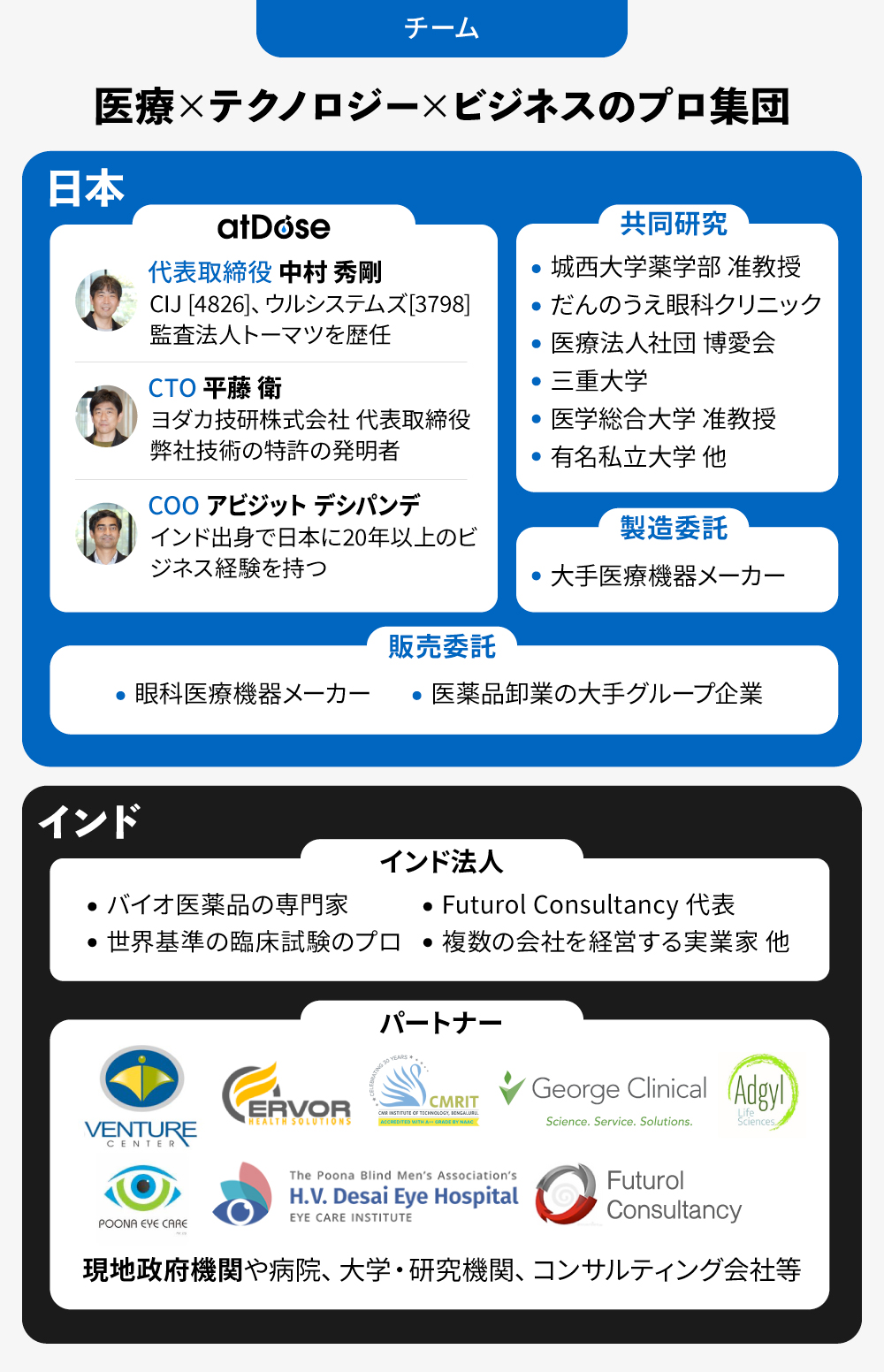 日本法人では、大手医療機器メーカーならびに製薬会社出身の濱野を中心に、城西大学薬学部の藤堂浩明准教授らとの開発体制を整えています。医薬品卸業の大手グループ企業とはNDA(秘密保持契約)を締結しているほか、眼科医療機器メーカーとは販売代理店として協議を進めています。