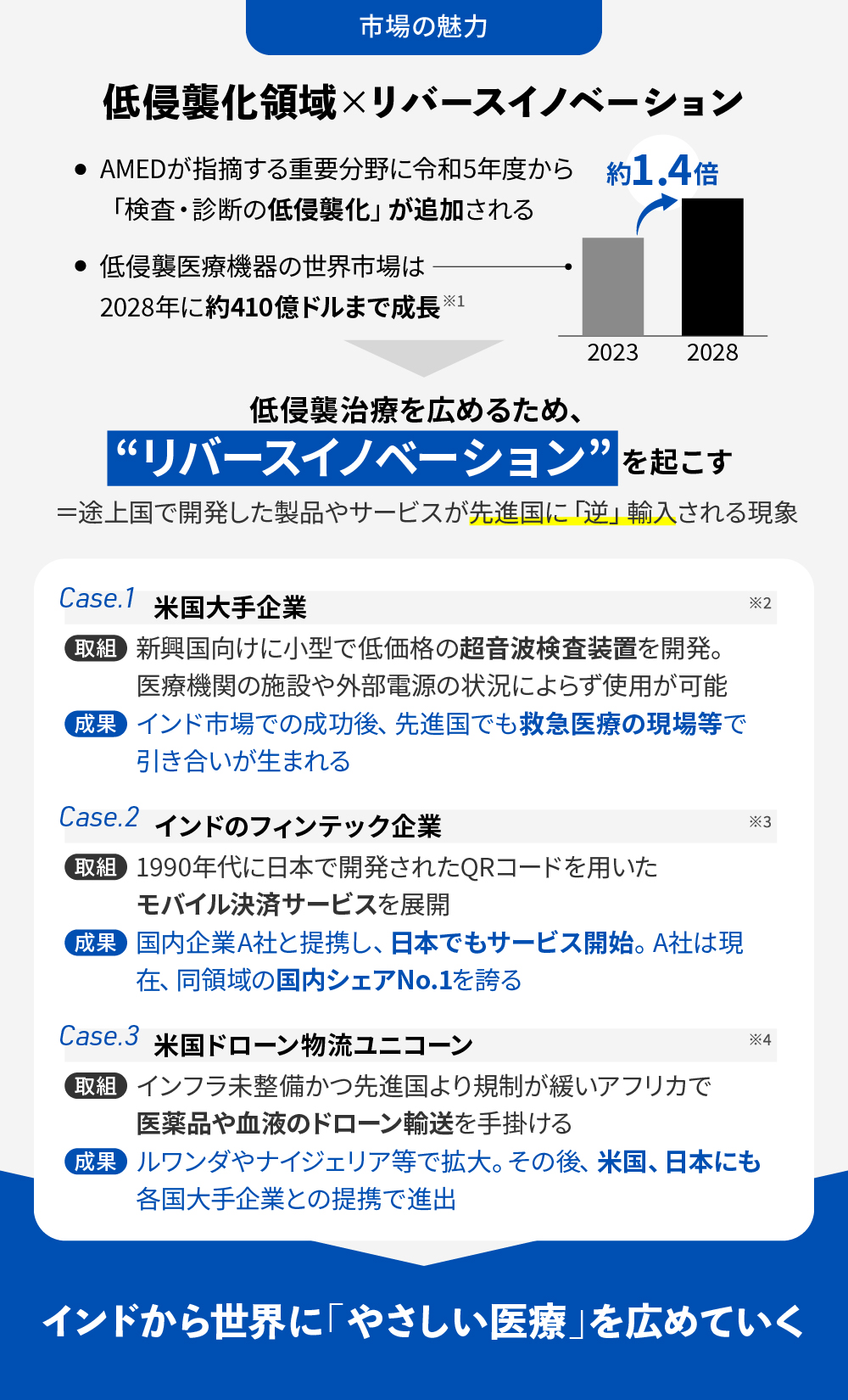 弊社は、これをインド市場から起こしていきたいと考えています。インドは成長市場であると同時に、インフラが未整備であったり、医療の面でも多くの社会課題を抱えています。一方でこれは、資源を有効に活用し、低価格かつシンプルで、先進国にも通用するイノベーティブな製品・サービスを生み出しやすい環境であり、新しい技術を導入しやすい環境であるとも考えられます。実際に、弊社が開発している新デバイスも、インド市場では販売までのプロセスがスムーズに進む見込みです。
