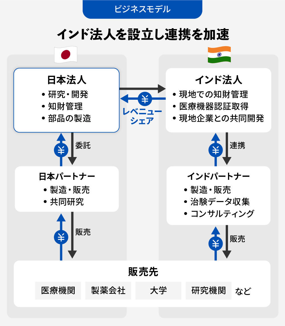 インド法人の役割は、弊社がライセンスを提供した知的財産のインド国内での管理、現地パートナーとの窓口機能、インド向けの医療機器認証取得、現地製薬企業との共同開発などです。インドでの売上が発生すれば、電気浸透流ポンプの販売利益は、レベニューシェアの形で一定の割合が日本法人にも還元される予定です。