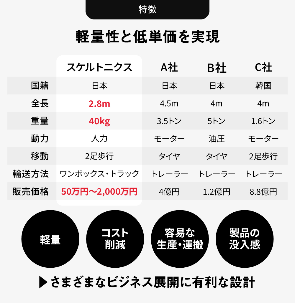 ãã¹ã±ã«ããã¯ã¹ãã¯ã人éãæä¹ã§ãããµã€ãºã®ãããããšããŠã¯æ°åããã°ã©ã çšåºŠã®å§åçãªè»œéæ§ãèªããŸããä»ç€Ÿã®ååã䌎ãããããã¯ãæ²¹å§åŒãŸãã¯é»ååŒã®ãã4mãµã€ãºãŸã§å€§ååããééãæ°ãã³ã«éããå Žåãã»ãšãã©ã§ãããã®çµæã1å°ãããã®è²©å£²äŸ¡æ Œã¯ååäœãšãªããåå°ãžã®èŒžéãã»ããã¢ããã«ãããè²»çšã ãã§ã1åã«ã€ãæ°åäžãæ°çŸäžåããããŸãã