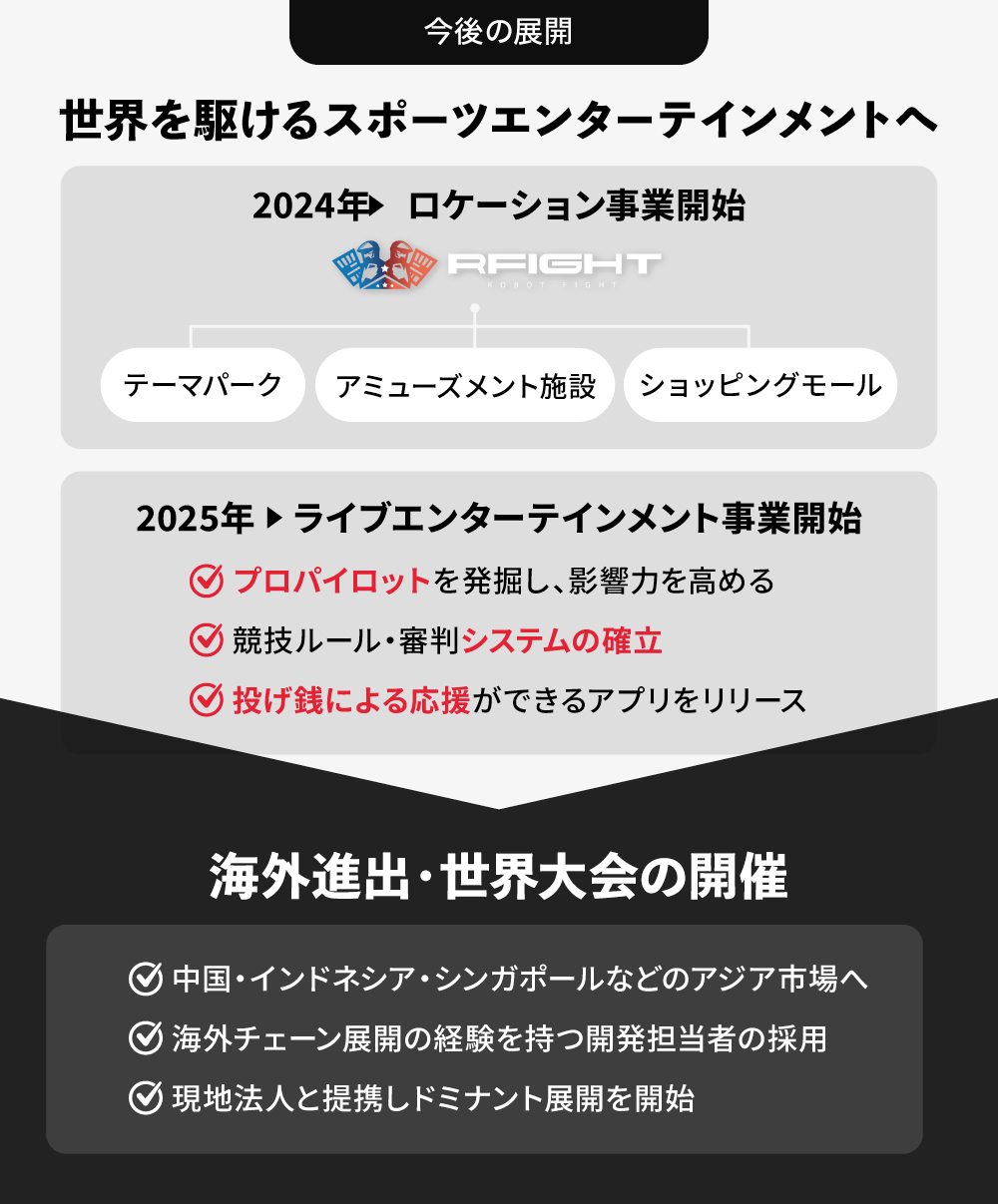 2029幎ã«ã¯ããR-FIGHTãäžç倧äŒã®éå¬ãèšç»ããŠããŸããã¢ãã¥ãŒãºã¡ã³ãã®åãè¶ ããŠãååœããéžæããããã€ãããããæå 端ã®ããããæè¡ãšé«åºŠãªæçžŠã¹ãã«ãç«¶ãåãå§¿ã§äººã ãé äºããäžççãªã¹ããŒããšã³ã¿ãŒãã€ã³ã¡ã³ãã«æé·ãããããšãç®æããã®ã§ãã