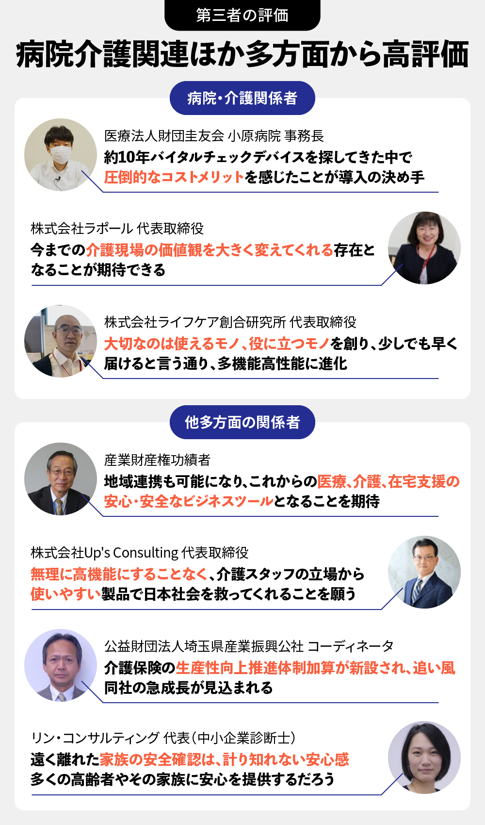 同社の「パルスハートバンドシステム」は、埼玉県の新技術・新製品開発補助金を活用して開発、そして、厚生労働省の福祉用具・介護ロボット実用化支援事業により介護現場での試験を実施し、ユーザによってその有効性が確認され好評を得ています。