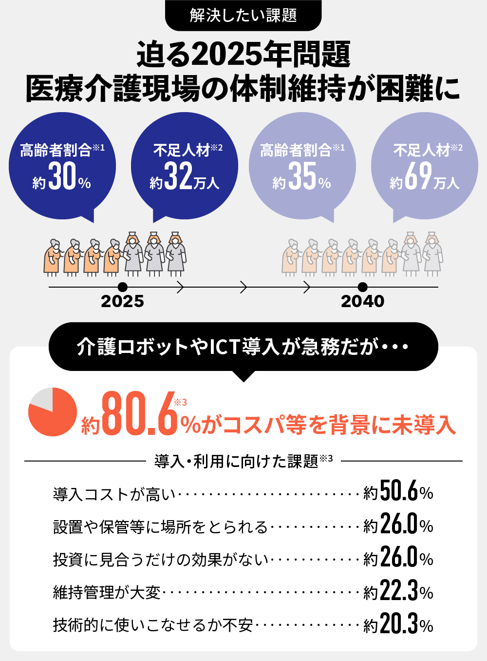 煩雑な業務を軽減し、本来注力すべき患者(入居者)のケアに注力していただくためにも、現場目線で使いやすく、コスト面でも導入しやすいサービス開発が求められています。