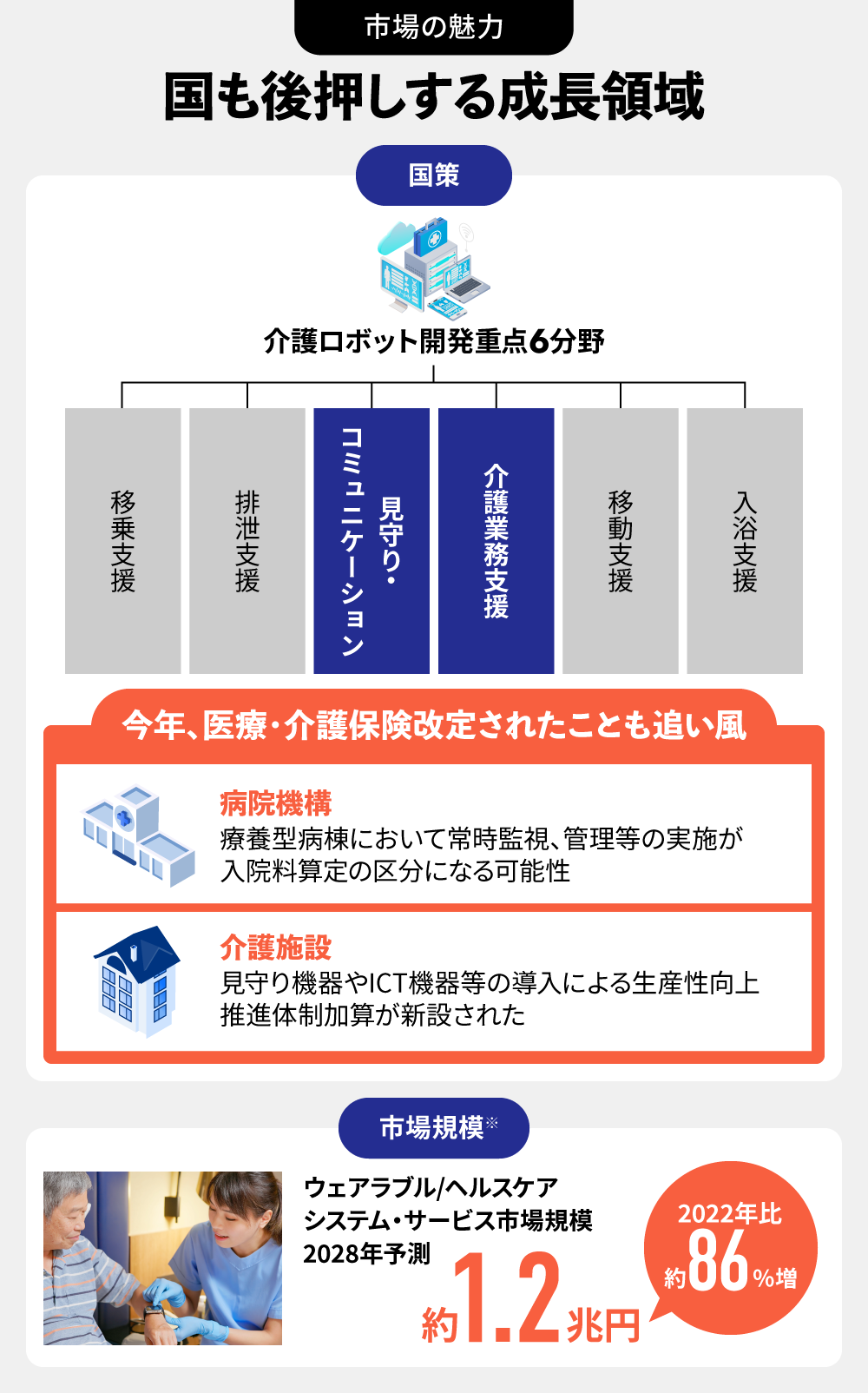また、今年4月に介護報酬、同年6月に医療報酬が改定されました。職員の業務負担軽減に資するICT導入や常時モニタリング体制を構築することで、報酬加算が見込めるようになるため、医療介護施設の導入意欲はより一層高まっていくと考えています。