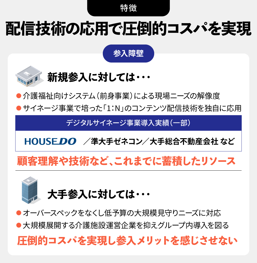 超高齢化社会の進行とともに多くの見守りサービスが生まれていますが、弊社は既存のデジタルサイネージ事業で培ったコンテンツ配信技術による独自のアプローチでシェア獲得を図ります。