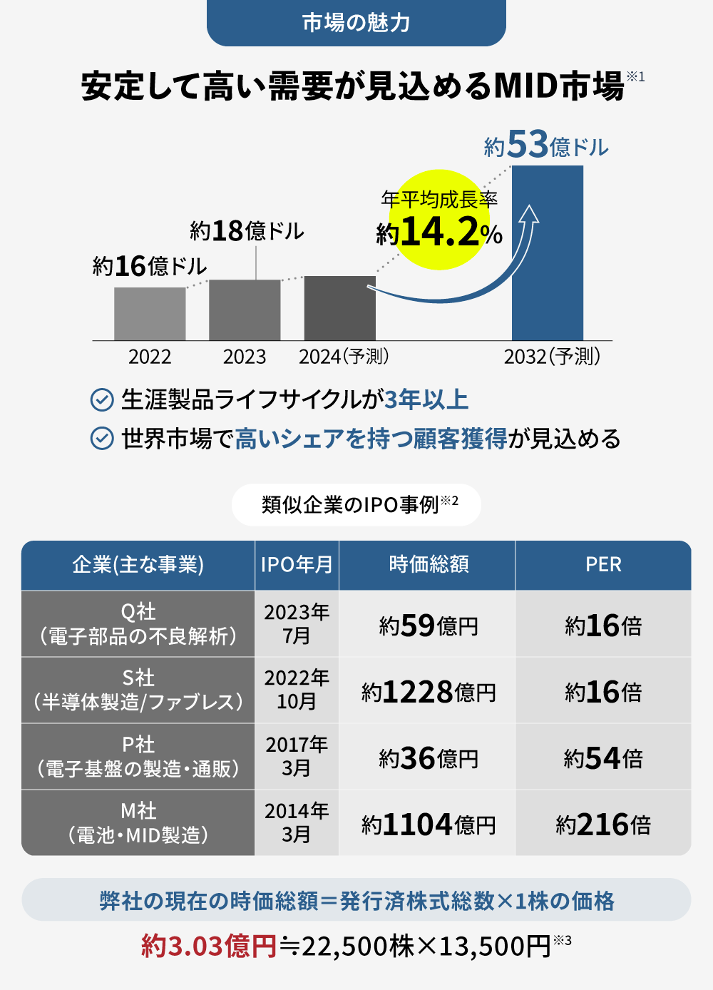 2023年時点での世界のMID市場は約18億ドル(約2,600億円)と推定されますが、2024年〜2032年は年率約14.2%の伸長が見込まれ、2032年には約53億ドル(約7,600億円)まで成長すると予測されています※。