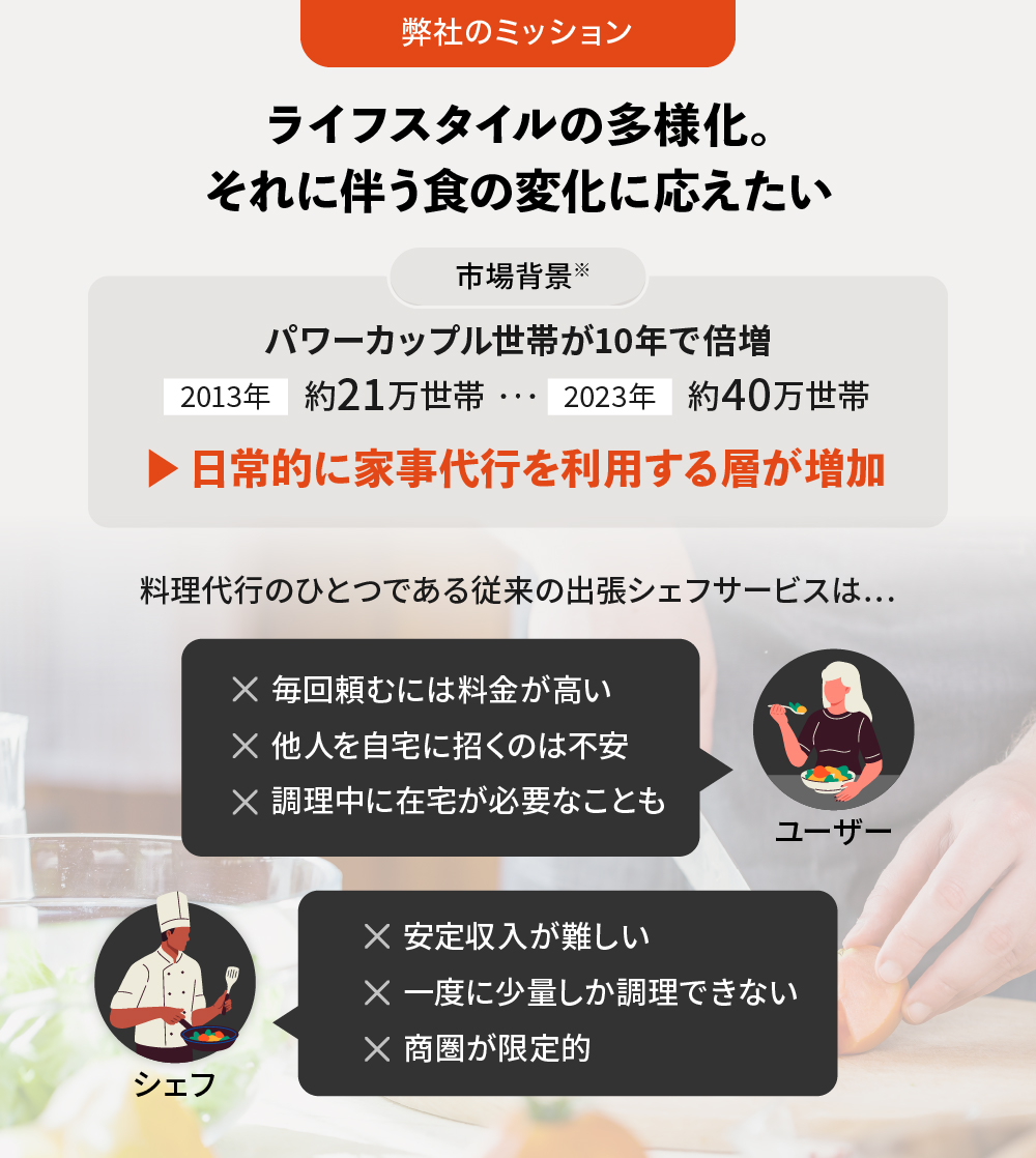 従来型の出張シェフサービスは、パーティーや記念日等の「ハレの日」と「いつもの食事」の二つのシーンで使われることが多いですが、前者は頻繁に注文があるわけではないので、シェフ視点では収入を安定させることが難しかったり、料理も特別なものを作れるスキルが求められるため、「家庭料理」寄りのスキルを持つシェフは単価を上げづらいという課題がありました。また、利用者目線でも、「プロとはいえ他人を家に上げるのは不安…」という悩みを持つ方も多く、こういった方は利用そのものが難しいという課題がありました。