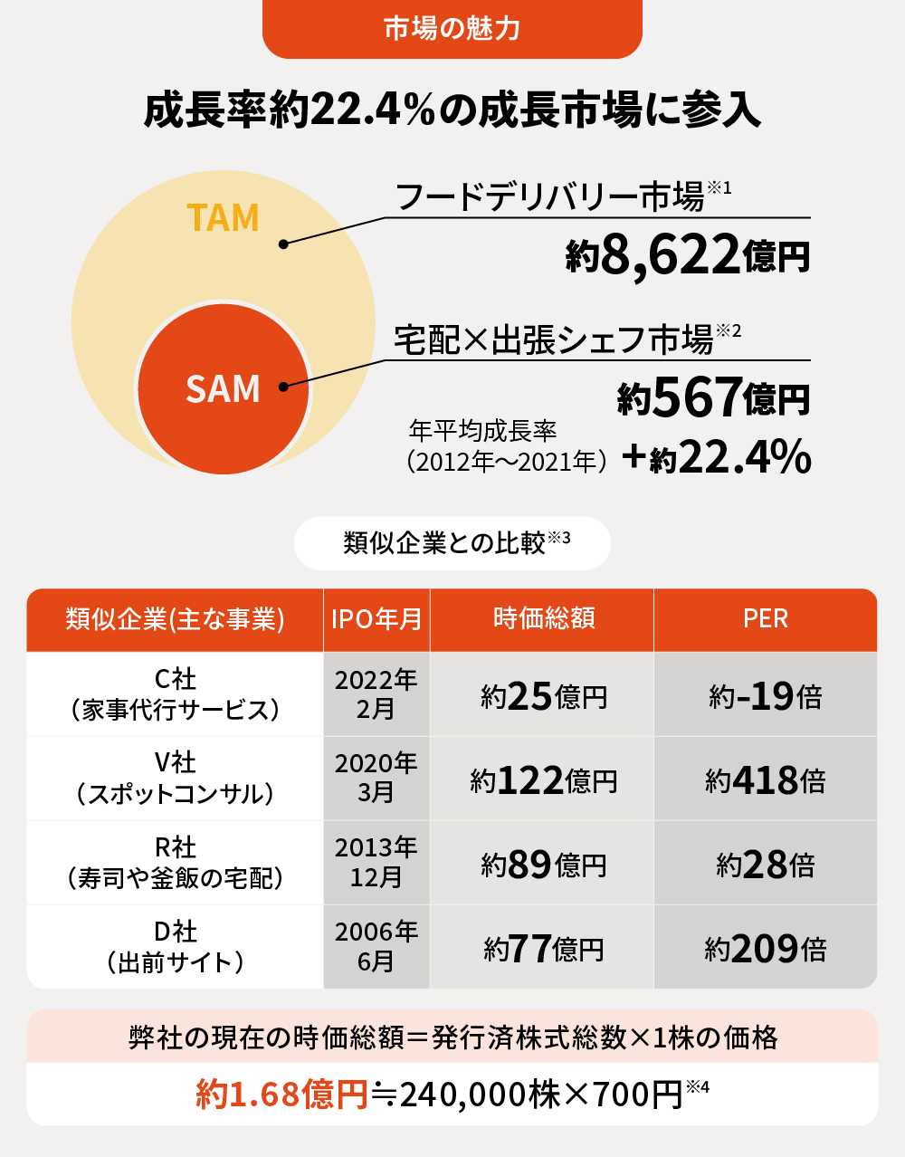 続くSAM(Serviceable Available Market:ターゲットを加味した市場規模)は宅配×出張シェフ市場で、その規模は約567億円、2012年から2021年にかけての年平均成長率(CAGR)は+約22.4%と試算しており※2、今後も非常に有望な市場と考えています。
