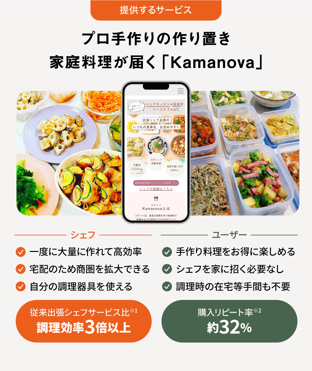弊社のサービス「Kamanova(カマノバ)」は、プロの料理人や経験豊富な栄養士等の料理人と、自宅で高品質な手作り料理を楽しみたいユーザーをマッチングするプラットフォームです。