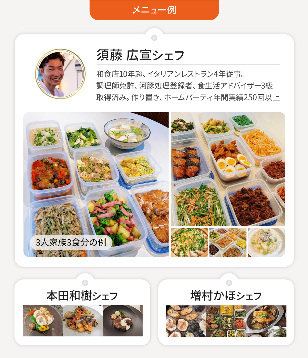 和食やフレンチ、イタリアンなど様々な経歴を持つシェフが登録しており、旬の食材を使用した家庭料理から、グレードの高い特別な料理まで取り揃えると共に、通常の宅食サービスでは難しい細やかなカスタマイズまで対応しています。