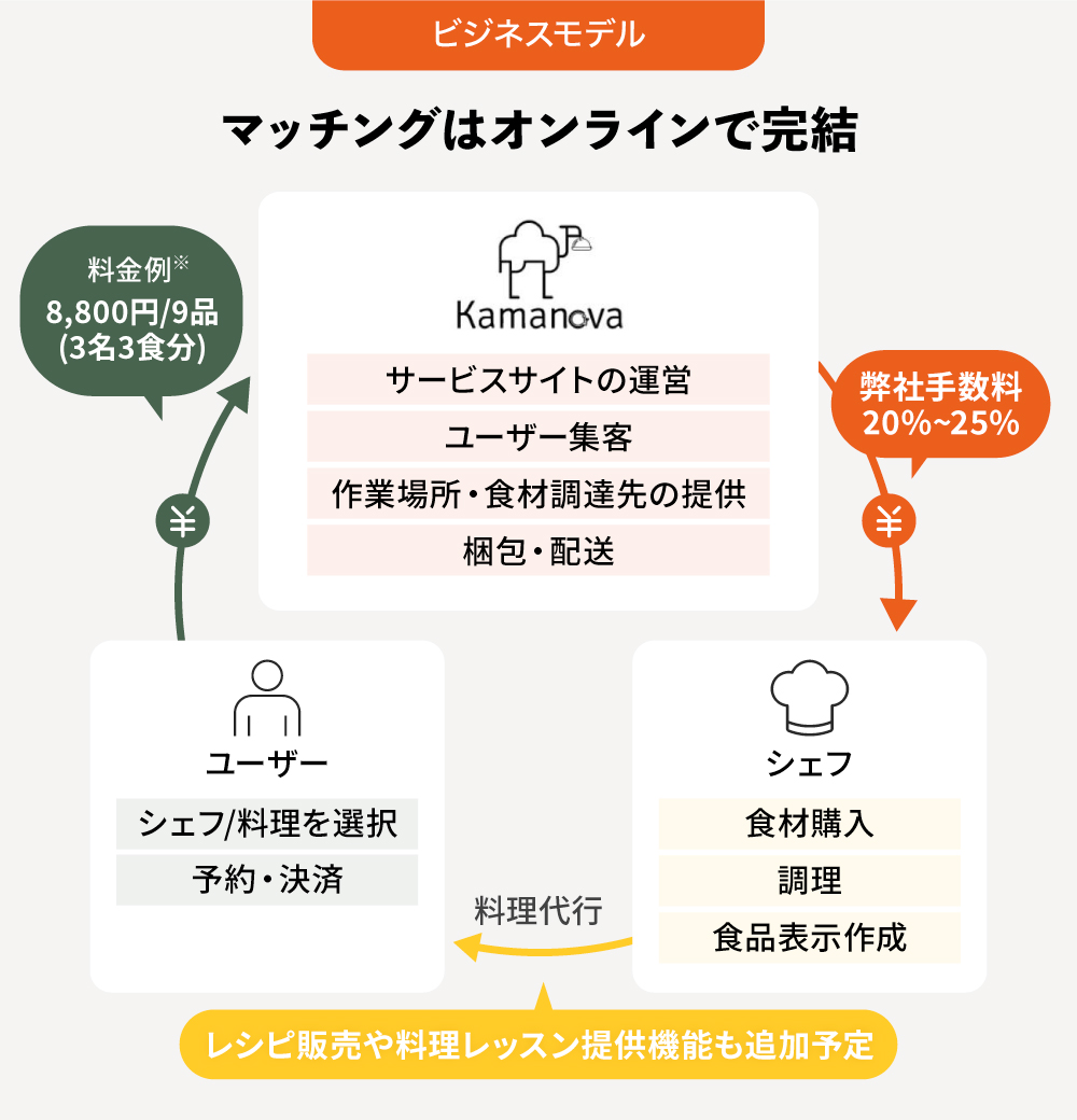 「Kamanova」は、シェフ側は「一度にたくさん作れるので報酬を増やしやすい」「商圏を圧倒的に拡張できる(例:東京のシェフが大阪のお客様の料理を作る)」「家庭用ではなく業務用の調理器具を使える」、ユーザー側は「他人を家に上げなくてよい」「効率よく作れる分、出張シェフよりも比較的安価」と双方にメリットのある構造を実現しています。
