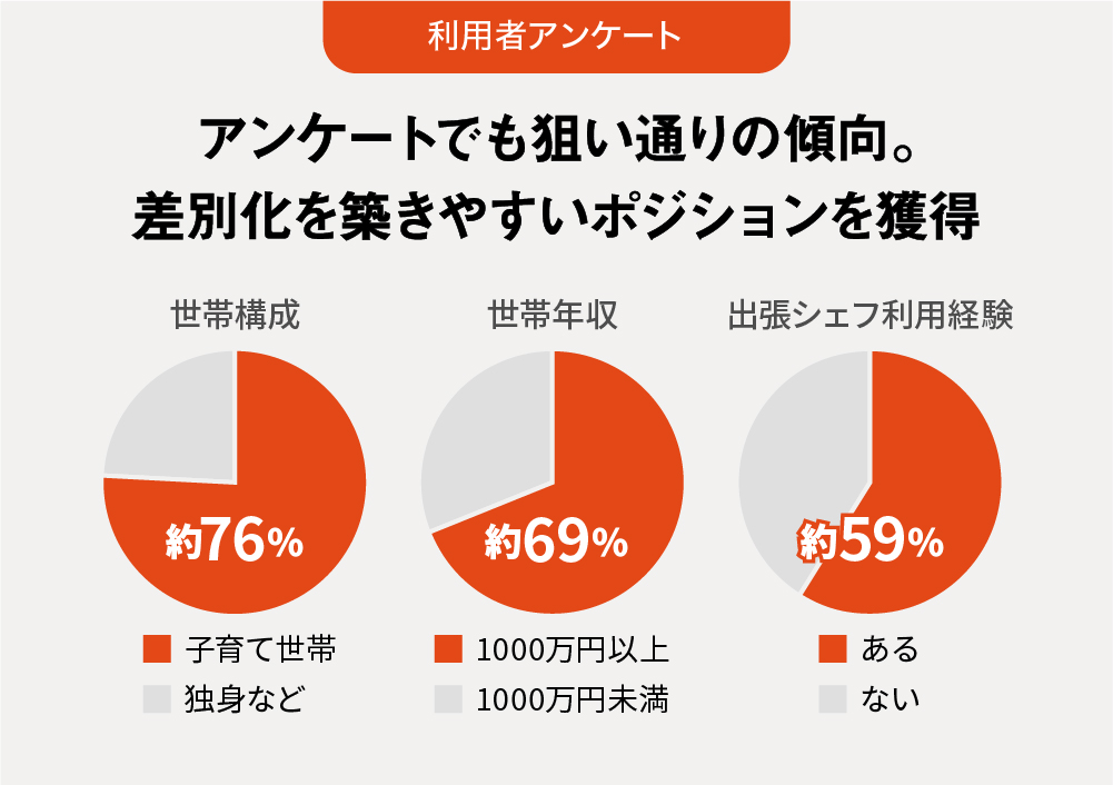 「Kamanova」は、最終的には価格帯を含めて出品するシェフの多様性を増大させることで、より多くのお客様に利用していただくことを目指していますが、足許では高所得×共働き世帯、いわゆるパワーカップル世帯をメインターゲットとして展開しています。既に利用いただいている方々のアンケートもこの傾向を裏づけており他社との差別化を築きやすいポジションを獲得できていると認識しています。